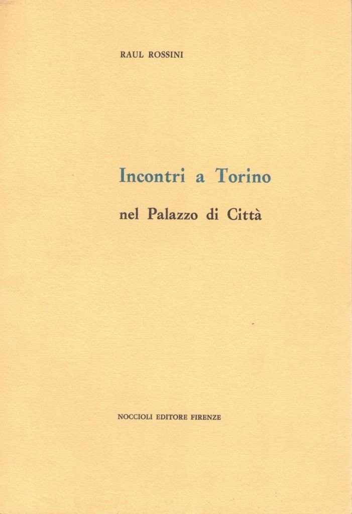 Raul Rossini, Incontri a Torino nel Palazzo di Città, Noccioli editore, Firenze 1969, pp. 101, ill. b.n., cm 24, br. ed. In calce alla quarta di copertina: Omaggio per il primo quadrimestre 1969 di Nuova Rassegna di legislazione Dottrina e Giurisprudenza. Rivista amministrativa quindicinnale per i comuni, le provincie e per gli altri enti locali (Casa Editrice R. Noccioli, Firenze). Il volume, scritto dall’insigne giurista Raul Rossini, raccoglie profili di vari artisti torinesi accomunati dall’essere tutti al contempo dipendenti o funzionari del Municipio di Torino. Indice: Cosimo Giorgieri-Contri – Ferdinando Viale (Paggio Ferdinando) – Cesare Laudi (Dario Cesulani) – Quintino Carrera – Alfonso Ferrero – Luigi Lupi – Giuseppe Cassano – Vincenzo Rondani – Vittorio Bussolini – Alessandro Lupo – Edoardo Vercelletti. Sovraccoperta mancante. Segno di piegatura all’angolo di una carta, per il resto ottimo.