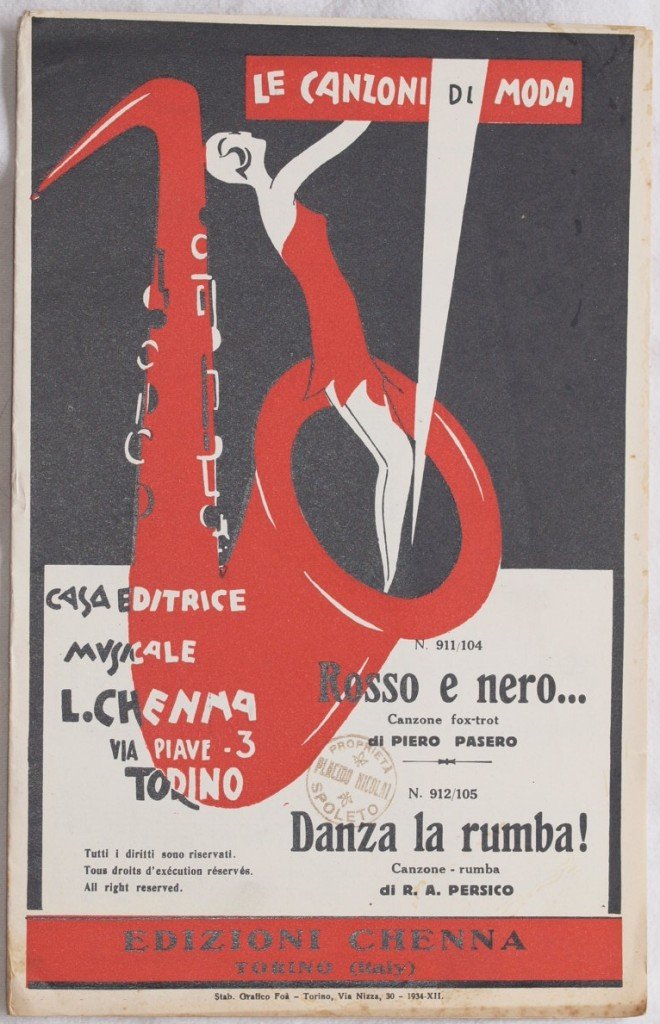 Bello spartito, partitura completa per orchestra del 1934 di due canzoni. Caratteristica copertina illustrata. GENERE: Fox trot; rumba STRUMENTI: pianoforte; violino; sassofono; tromba; trombone; basso; batteria ANNO: 1934 DIMENSIONI: In 8. cm 27,5x17,55 PAGINE: pp. 23 CONDIZIONI: Ottime condizioni NOTE: Ex libris sulla copertina ed in qualche pagina. Beautiful score of one song, a complete score for orchestra of 1934. Carachteristic decorated cover of that period. MUSIC: Fox trot; rumba STRUMENTI: piano; violin; saxophone; trumpet; trombone; bass; drums YEAR: 1934 SIZE: In 8. cm 27,5x15 PAGES: pp. 23 CONDITIONS: Very good conditions NOTES: Ex libris in the cover and in some pages.