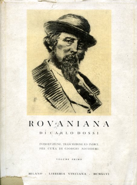 2 voll. in-8°, pp. XXXIV, 538, (4); 543-907, (3) [paginazione continua], brossura editoriale con sovraccoperte figurate. 6 tavv. in b.n. f.t. Ampi indici e appendice di documenti inediti. Alcune minime tracce d'uso alle sovraccoperte, ma ottimo esemplare a fogli chiusi. Prima edizione, postuma, impressa in 700 esemplari, di questa appassionata e apologetica opera, al crocevia tra biografie e studio critico, che Carlo Dossi volle dedicare al suo corregionale Giuseppe Rovani, celebre soprattutto per il ciclopico affresco dei 'Cento Anni'. Dossi esalta fervidamente l'opera rovaniana, anteponendola persino all'arte di Manzoni, e traccia un vivace affresco della Scapigliatura lombarda nel suo complesso. 'Rovani è il continuatore logico di Manzoni, come il Dossi di Rovani', scrive egli in terza persona fissando un'ideale linea lombarda di cui il Dossi si poneva come erede e prosecutore. L'opera avrebbe dovuto far parte dell'edizione delle opere di Dossi edita da Treves dal 1910 al 1927, ma che non venne mai inserita e venne qui pubblicata, 36 anni dopo la morte del Dossi, a cura del Nicodemi, che riordinò e studiò l'immensa e disordinata mole di carte lasciate dallo scrittore lombardo. CUBI, 208243. BNI 1948, 6593.