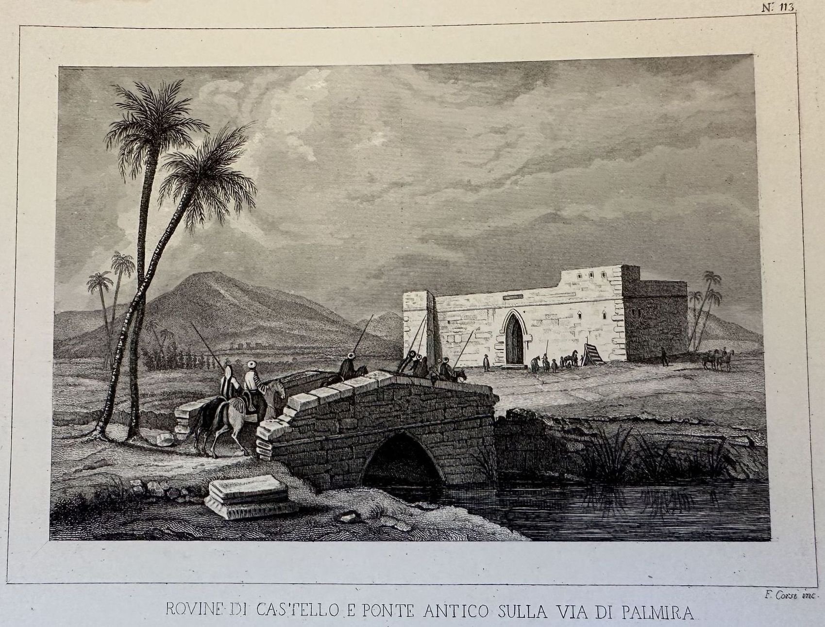 Veduta animata delle rovine di castello e ponte antico sulla via di Palmira del 1835 circa. AUTORE: Francesco Corsi (1833-1862) TECNICA: Acquaforte DIMENSIONI FOGLIO: cm 16x25<BR>DIMENSIONI INCISIONE: cm 14,5x10,5<BR>EPOCA: 1835 circa CONDIZIONI: Buone. FioritureAnimated view of the ruins of the castle and ancient bridge on the street of Palmira of 1835 circa. AUTHOR: Francesco Corsi (1833-1862) TECHNIQUE: Etching LEAF DIMENSION: cm 16x25ENGRAVING DIMENSION: cm 14,5x10,5<BR> DATE: 1835 circa CONDITIONS:Good conditions. Foxing