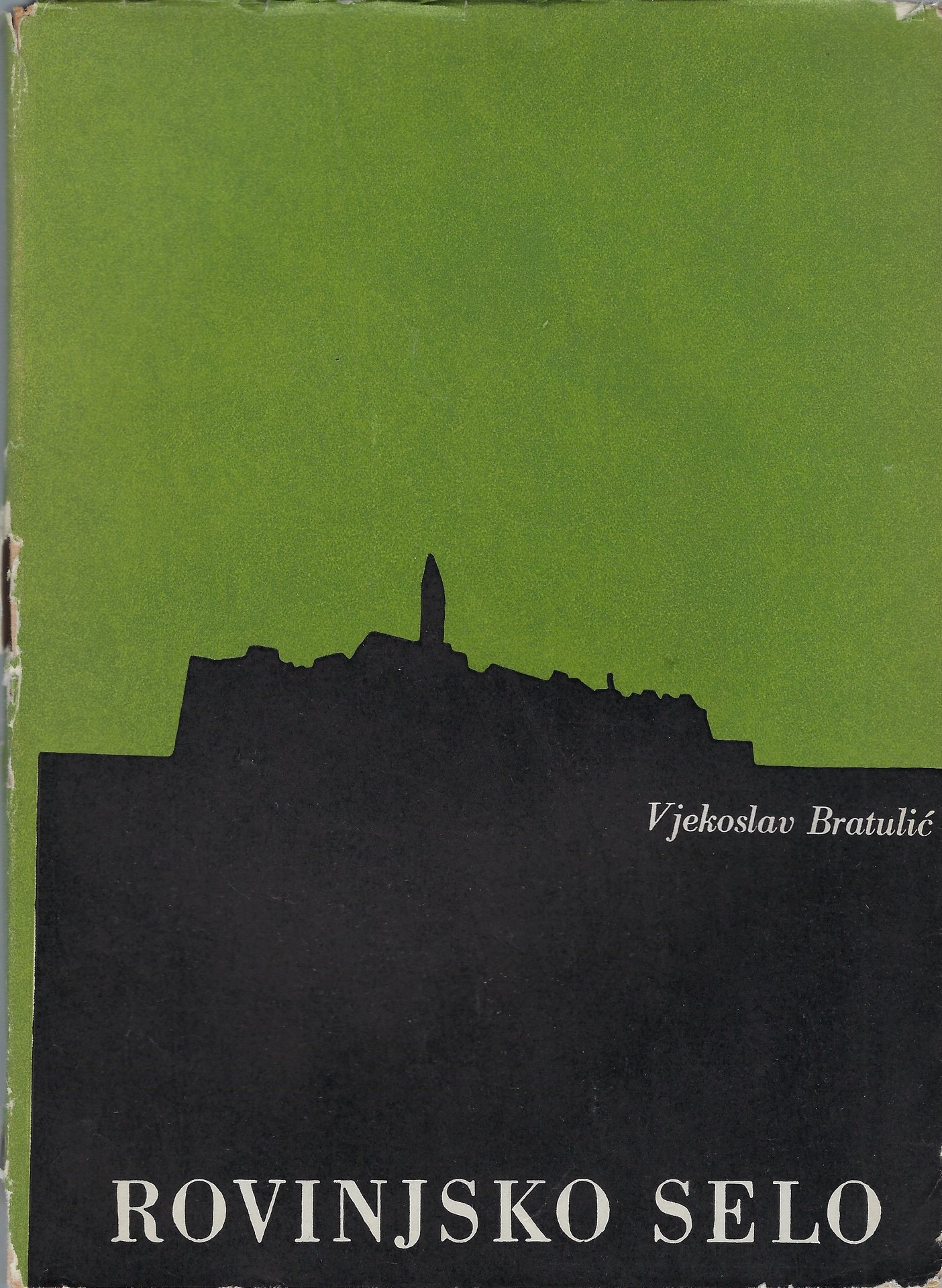 Sovraccoperta con schizzo della città di Rovigno al piatto anteriore. Risulta usurata e un po' rovinata, con abrasioni e pezzettini mancanti.
