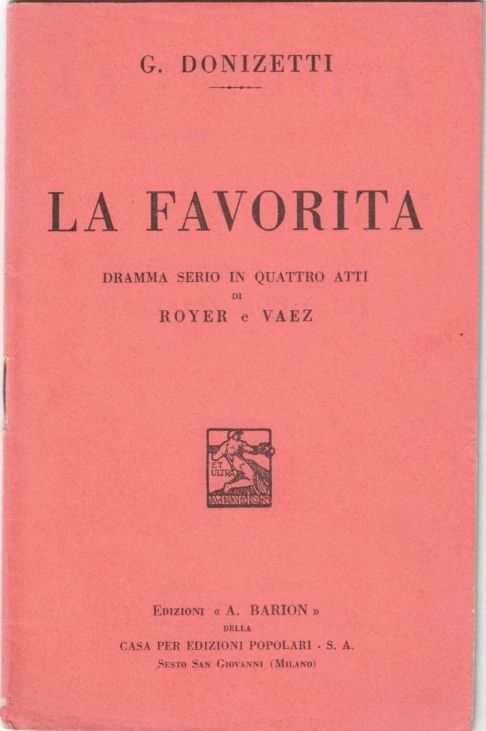 La favorita. Dramma serio in quattro atti di Royer e Vaez. Tradotto da F. Janetti. Musica di Gaetano Donizetti, Edizioni A. Barion della Casa per Edizioni Popolari S. A., Sesto San Giovanni (Milano) 1934, pp. 32, cm 19, rilegatura ed. a punto metallico. Minime tracce d’uso, lievissima brunitura della carta, per il resto ben conservato.