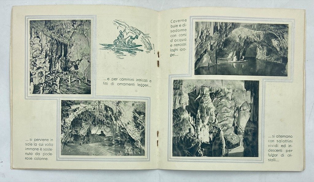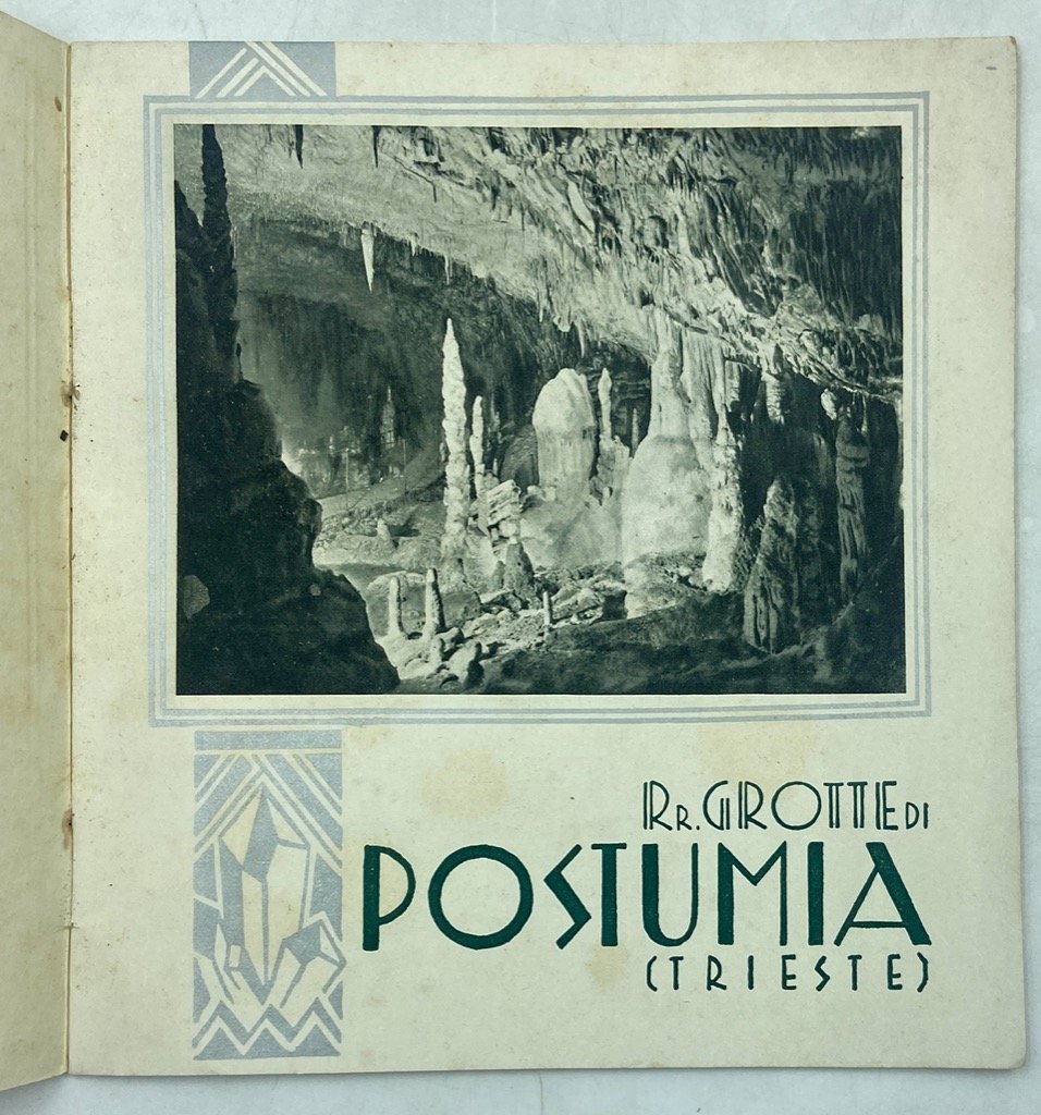 Opuscolo turistico spillato, piatto anteriore fustellato e stampato in verde e argento, cm16.5x17.5, pp (20); belle illustrazioni in nero stampate in rotocalco, con cornici e fregi argentati e testo in verde, due tavole ripiegate in velina, con carta geografica e linee automobilistiche e con notizie sugli alberghi. Buono stato, lievi fioriture e un'orecchia sul piatto anteriore. Bella pubblicazione turistica di gusto deco' per le grotte di Postumia, con timbro dell'ufficio triestino della Compagnia Italiana Turismo in copertina. Le illustrazioni fotografiche, stampate in nitido rotocalco, mostrano l'interno delle grotte, speleologi e figure fantastiche, attrazioni turistiche, l'ufficio postale sotterraneo, i Concerti Mascagni del 1929, le strutture balneari e i bagnanti di Abbazia.