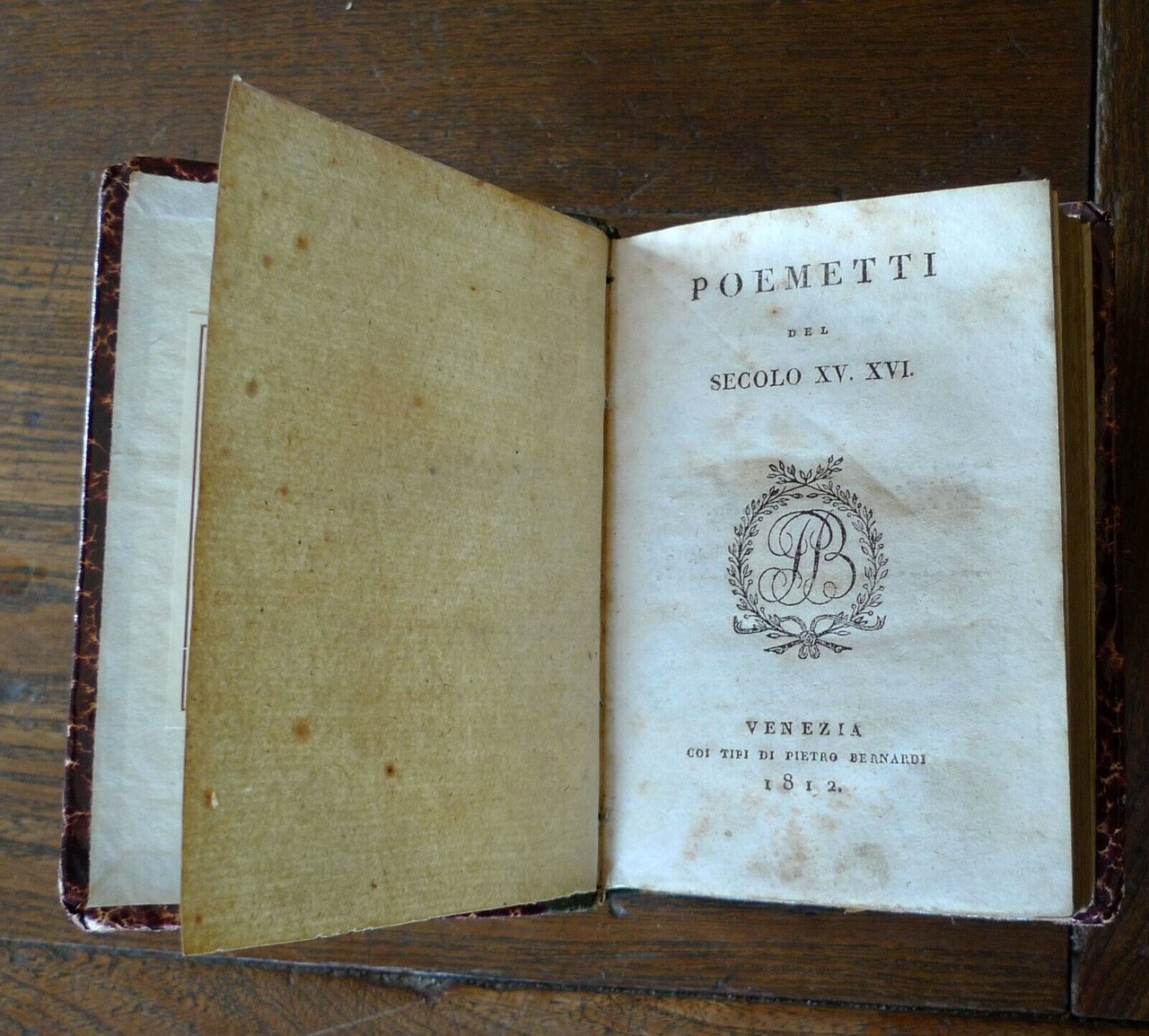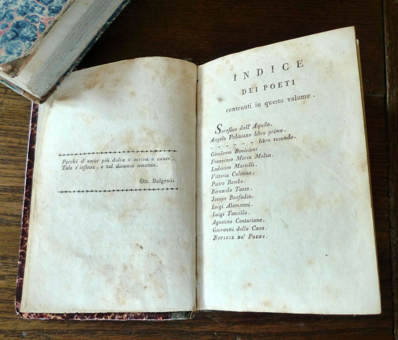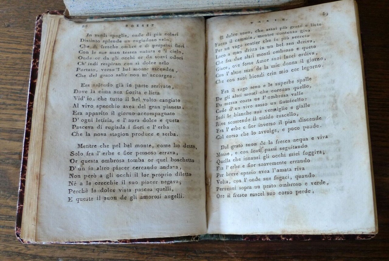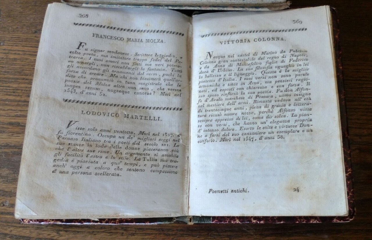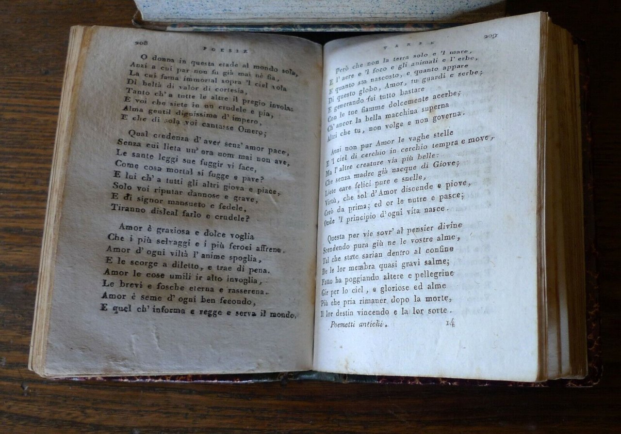 [A cura di Andrea Rubbi]POEMETTI DEL SECOLO XV. XVI.Venezia, coi tipi di Pietro Bernardi, 1812,copertina rigida, rilegatura in mezza pelle,13x9,5 cm., pp.374,sono presenti i seguenti poeti:Serafino dall'Aquila, Angelo Poliziano,Girolamo Benivieni, Francesco Maria Molza,Lodovico Martelli, Vittoria Colonna,Pietro Bembo, Bernardo Tasso, Jacopo Bonfadio,Luigi Alamanni, Luigi Tansillo, Agostino Centurione, Giovanni della Casa,peso: g.180