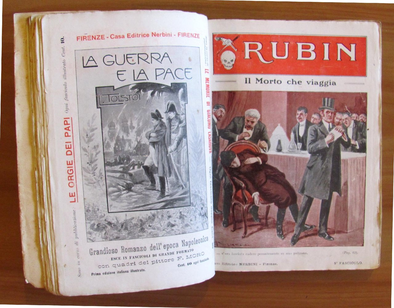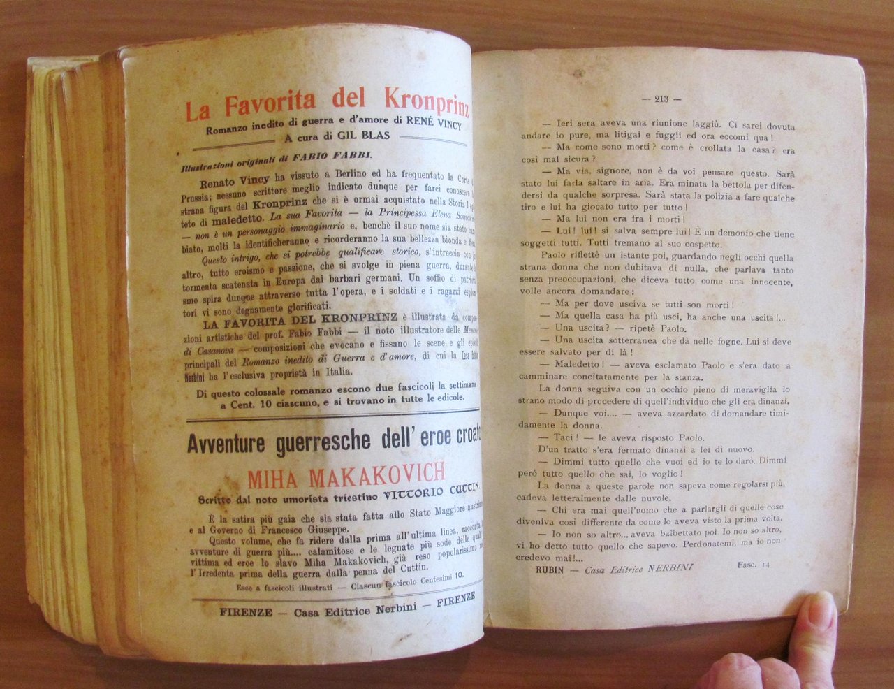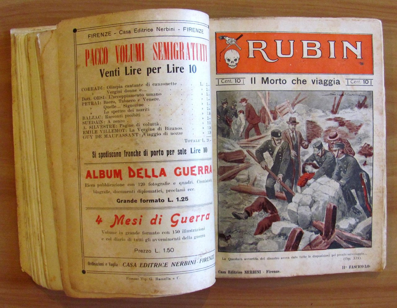 Opera completa in 14 fascicoli con Illustrazioni a colori alle copertine di Menotti Scagliarini. Casa Editrice Nerbini - Firenze, 1915. Rilegato in brossura editoriale con frontespizio, indice e copertine originali dei fascicoli, anche posteriori, conservate all'interno. La copertina editoriale risulta molto usurata, incluso il dorso quasi completamente mancate e malamente rinforzate al tempo con carta quadrettata, idem la cerniera anteriore mentre le restanti copertine sono tutte in buonissimo stato come i fascicoli che presentano solo leggere, sporadiche fioriture. Manca la sola copertina originale dell'ultimo fascicolo. 16x22; pp.241. Rarissimo e un Buono stato. , Buono (Good)