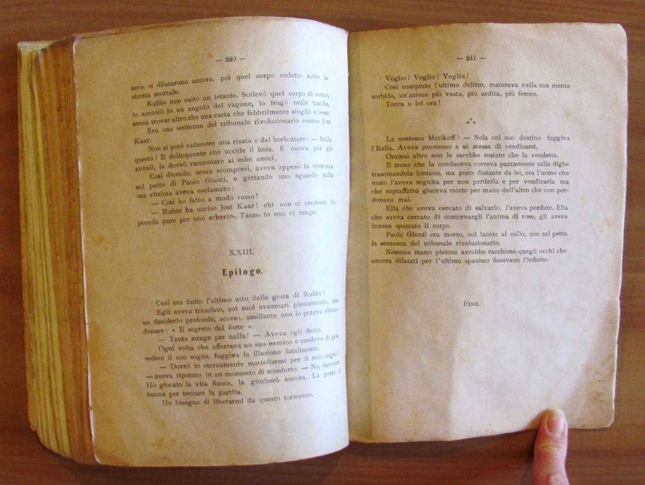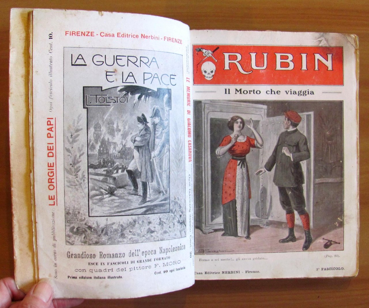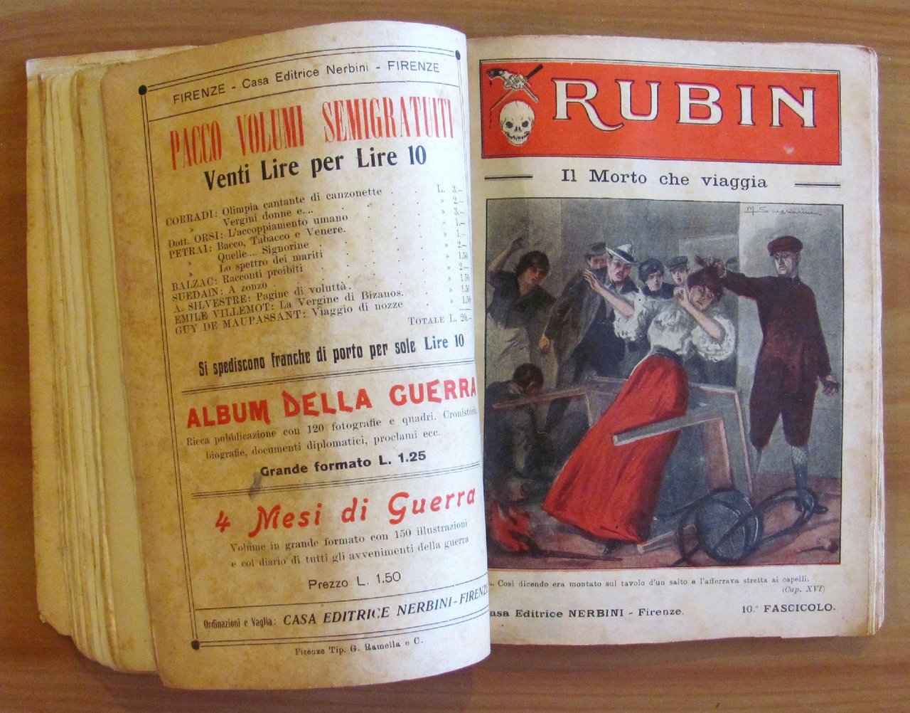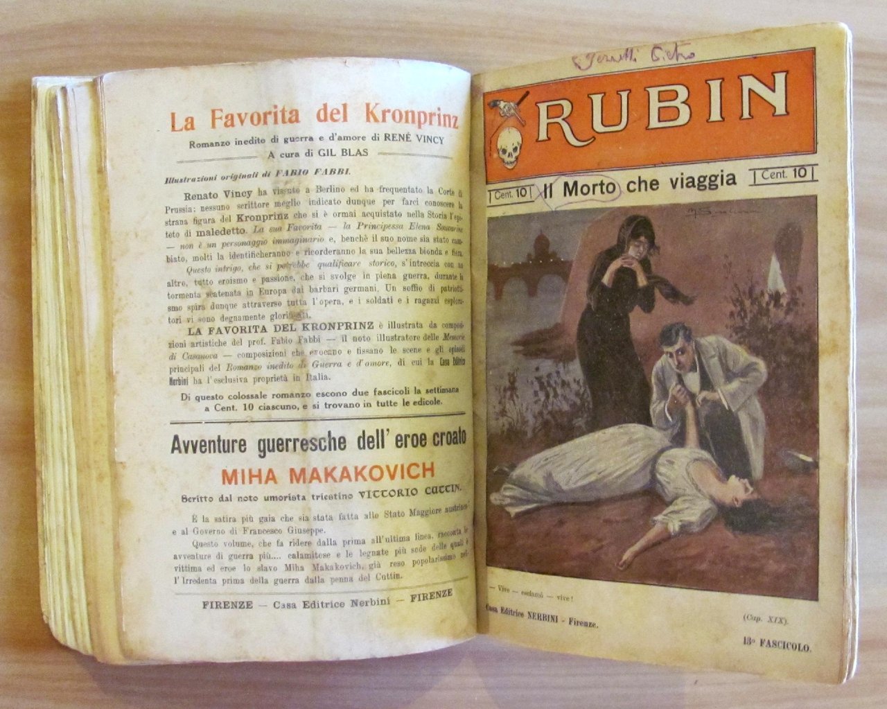 Opera completa in 14 fascicoli con Illustrazioni a colori alle copertine di Menotti Scagliarini. Casa Editrice Nerbini - Firenze, 1915. Rilegato in brossura editoriale con frontespizio, indice e copertine originali dei fascicoli, anche posteriori, conservate all'interno. La copertina editoriale risulta molto usurata, incluso il dorso quasi completamente mancate e malamente rinforzate al tempo con carta quadrettata, idem la cerniera anteriore mentre le restanti copertine sono tutte in buonissimo stato come i fascicoli che presentano solo leggere, sporadiche fioriture. Manca la sola copertina originale dell'ultimo fascicolo. 16x22; pp.241. Rarissimo e un Buono stato. , Buono (Good)