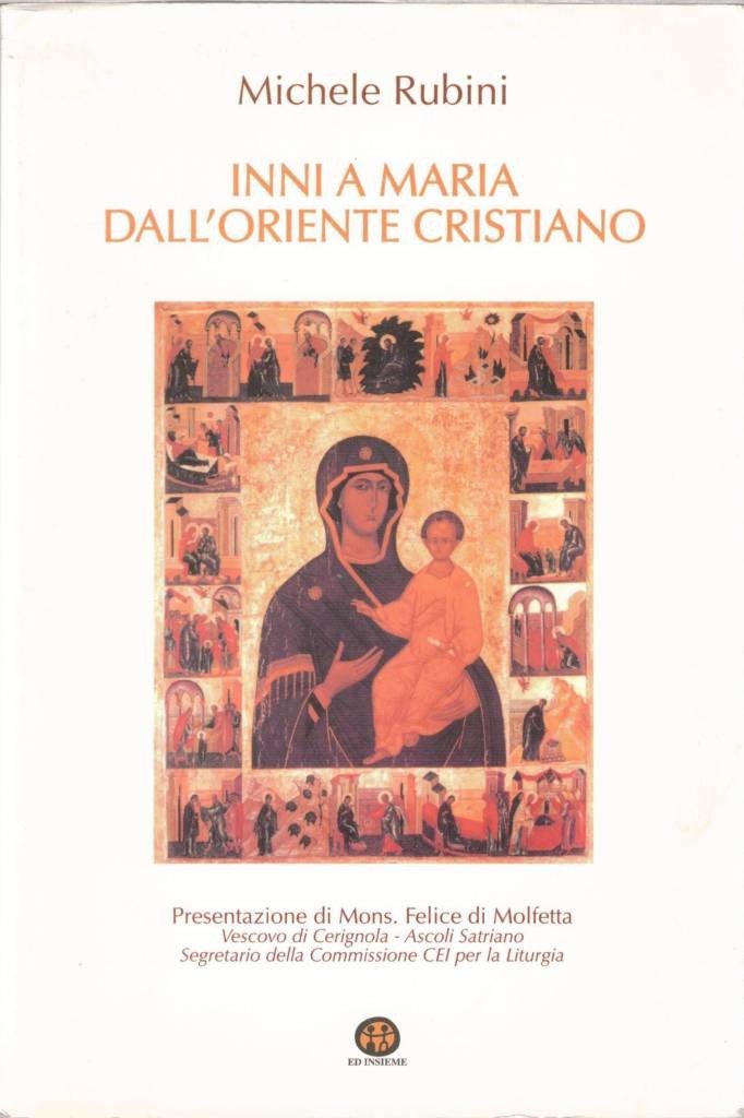 Michele Rubini, Inni a Maria dall’Oriente cristiano, presentazione di Mons. Felice di Molfetta, Ed Insieme, Terlizzi 2003, pp. 110, 4 c. di tavv. ill. col., cm 21, br. ed. Collana Sentieri, n. 29. Tracce d’uso, qualche carta un po’ sgualcita, per il resto ben conservato.