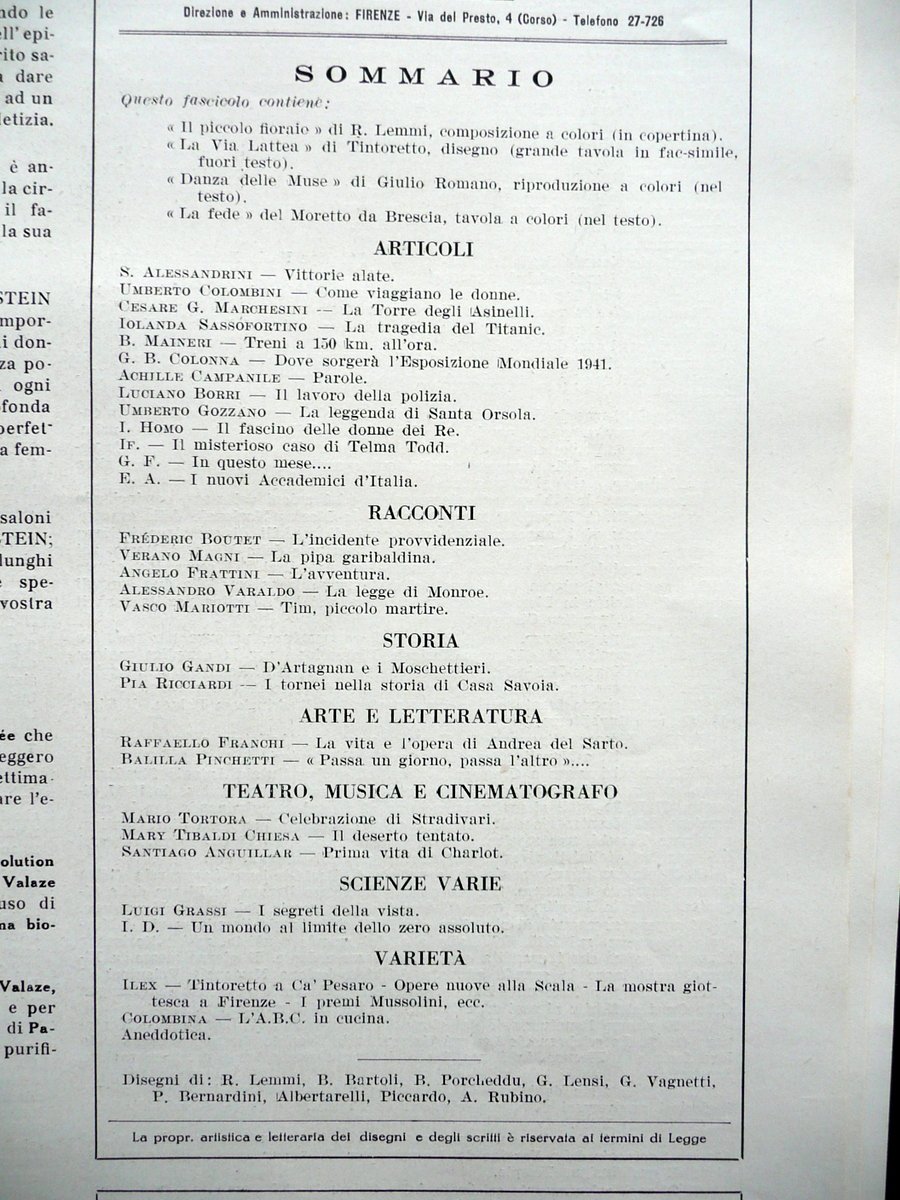 Rivista, Passa un giorno passa l'altro" racconto firmato Balilla Pinchetti con belle illustrazioni a colori di Antonio Rubino in "Scena Illustrata" Anno 52 - Numero 5 1 - 15 maggio 1937 Firenze 1937; cm 34x28; pp. 36-IV, con numerose ill. in b/n e a colori; brossura ed. ill. a colori (esemplare a fogli sciolti per mancanza delle cuciture). Numero completo. Condizioni di conservazione Esemplare complessivamente ben conservato con tracce d'uso, a fogli sciolti per mancanza delle cuciture; dorso con strappetti di alcuni cm, minimi forellini e tracce di precedente inserimento dell'esemplare entro raccolta / volume (a ciò sono dovute le lievi rifilature ai margini). Interni buoni; poche pagine con qualche pressoché trascurabile abrasione da distacco (vedi foto). Il breve racconto (due pagine) di cui sopra è corredato da alcune illustrazioni a colori di Antonio Rubino. Numero completo (per un elenco completo degli argomenti trattati vedi foto indice). RVS001N00218 N "