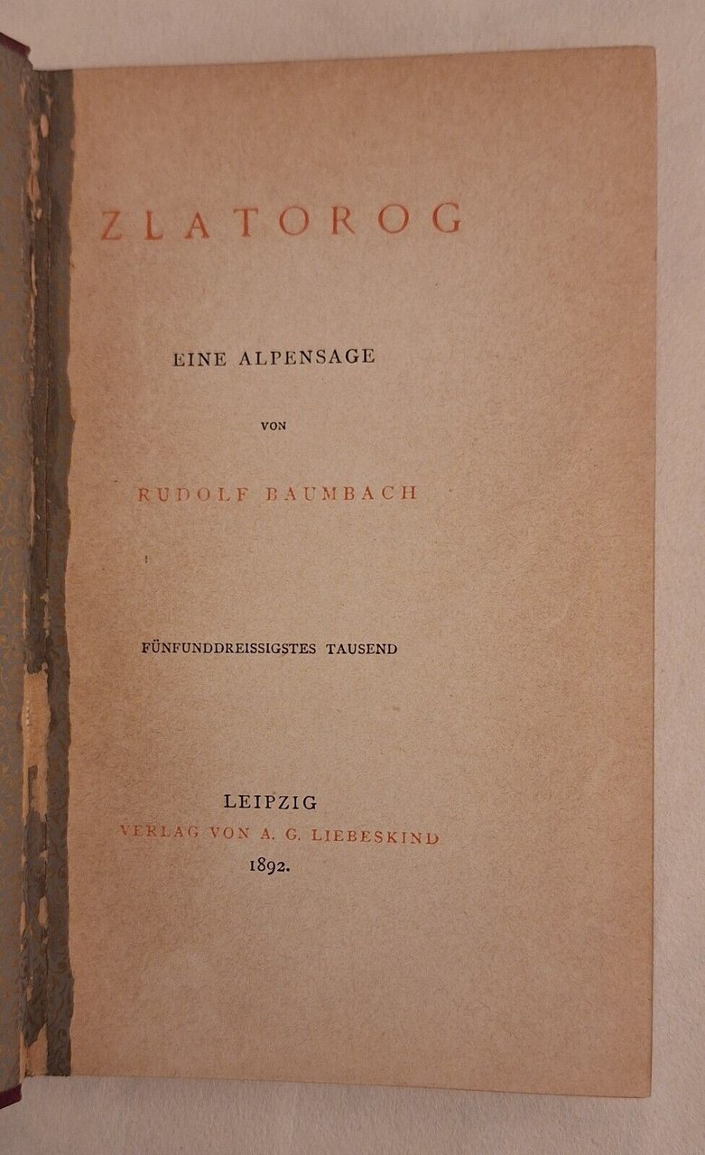 RUDOLF BAUMBACH ZLATOROG EINE ALPENSAGE LEIPZIG LIEBESKIND 1892In 12°, legatura editoriale, copertina illustrata con titolo e fregio in oro al dorso e al piatto, 164 ill. a colori.In ottime condizioni, strappo alla controsguardia restaurato.