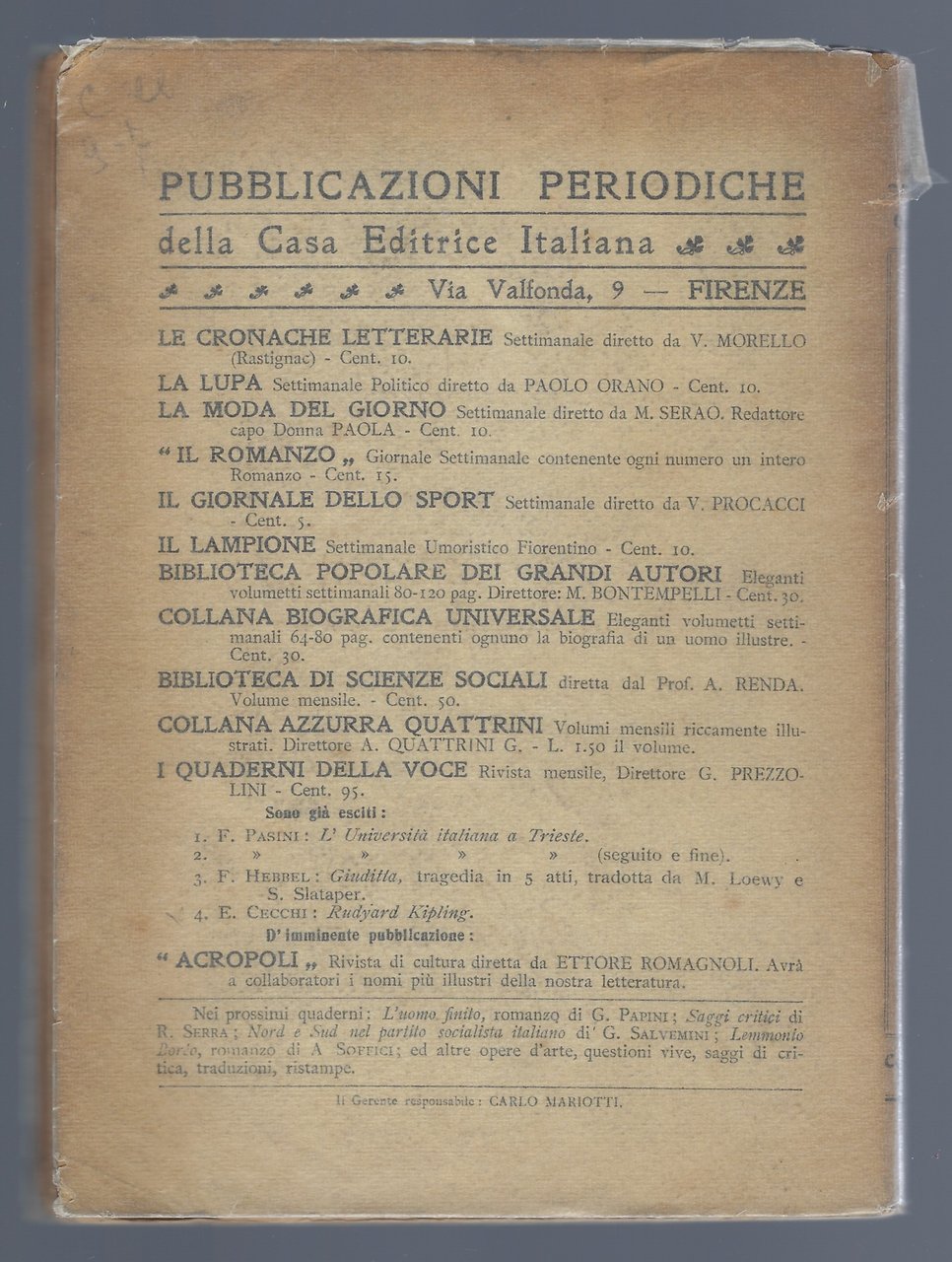 Legatura in brossura editoriale con sovraccoperta protettiva trasparente, usurata, con bruniture e strappi alla testa del dorso.