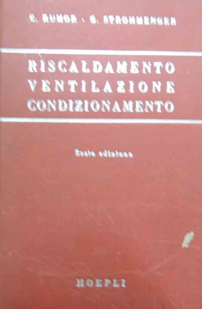 Carlo Rumor, Giovanni Strohmenger, Riscaldamento Ventilazione Condizionamento Impiani Sanitari, Manuale teorico-pratico, Editore Ulrico Hoepli, Milano 1954, sesta ed., pp. XXIV, 499, ill. b.n., 2 c. di tavv. f.t. ill. b.n. con tabelle, cm 16, cart. ed. con titoli al dorso e al piatto anteriore e fregio a impressione al piatto posteriore. Collana manuali Hoepli. Minime fioriture ai tagli, leggera brunitura della carta, per il resto buona copia.