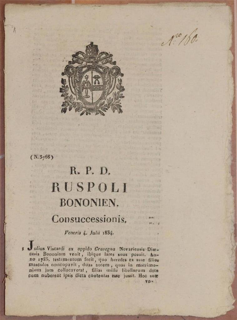 In 4. Dim. 29x21 cm. Pp. (4). Interessante pubblicazione del 1834, una sentenza del Tribunale della Sacra Rota del 4 Luglio 1834 per una causa nella diocesi di Bologna. Si tratta della causa per il testamento di Giulio Viscardi da Cravegna (Crodo) che passò dalla diocesi di Novara a quella di Bologna. Nel 1785 fece testamento lasciando l'eredità ai figli maschi e la dote alla figlia femmina. In buone condizioni. Copertina assente. Legatura assente. All'interno le pagine si presentano in buone condizioni con fioriture e bruniture. Interesting pamphlet of 1834, a sentence of the Trial of Sacra Rota for a trial of 4th of June 1834 in the diocesis of Bologna. It is the trial for the testament of Giulio Viscardi from Cravegna (Crodo) who passed fom the diocesis of Novara to that of Bologna. Nel 1785 he wrote testament leaving the heredity to sons and the dowry to his daughter. In good conditions. Cover is missing. Binding is missing. Inside pages are in good conditions with foxings and yellowings.