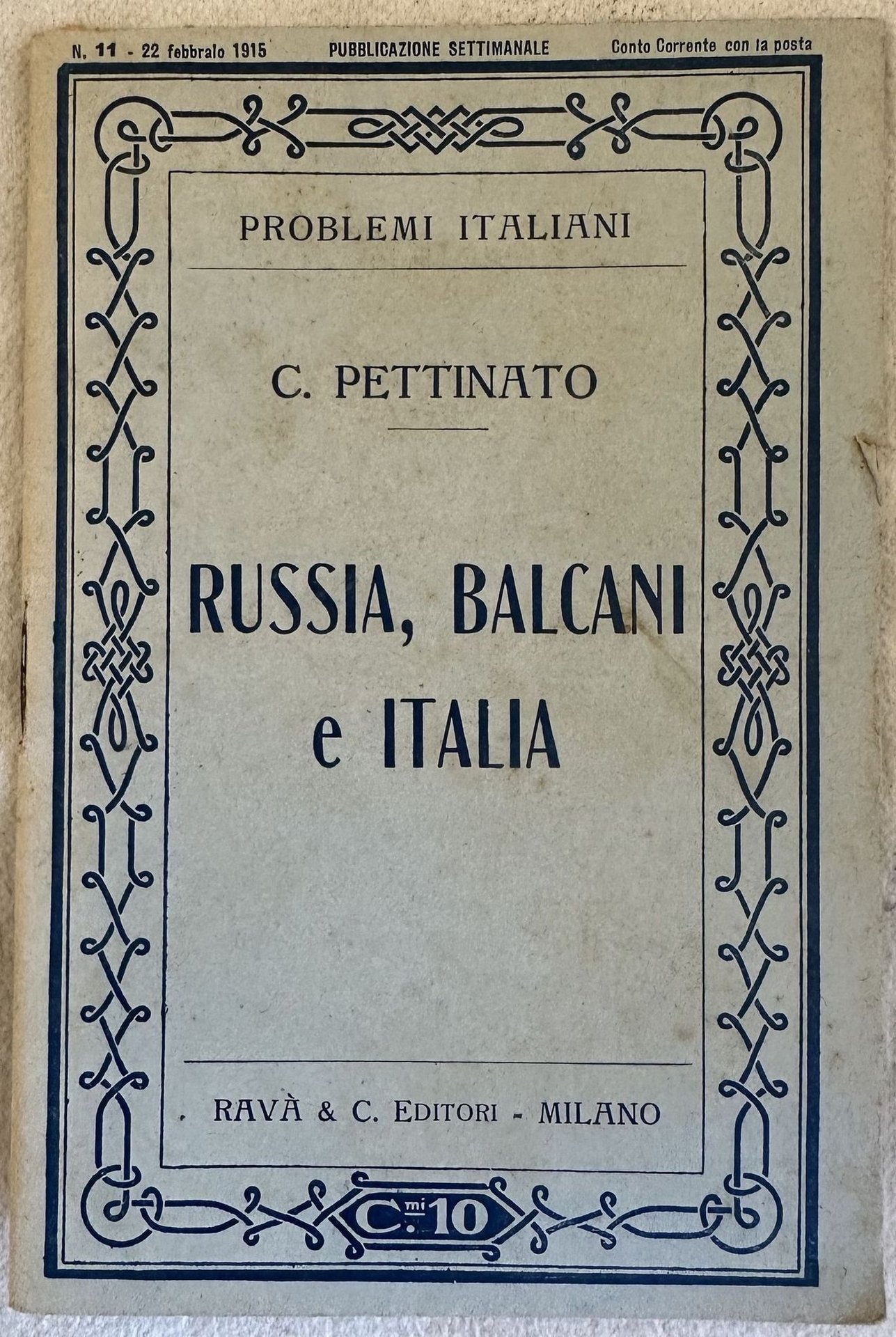 Edizione del 1915 di questa monografia della collana "Problemi italiani" n. XI sulla Russia i Balcani e i loro rapporti con l'Italia di Concetto Pettinato. All'interno: Civiltà e barbarie, Idee sociali, Ideali politici e religiosi, La Russia del Governo, La germanizzazione, L'intrigo tedesco nella politica russa, Il genio tedesco dell'Impero, Il sofisma dell'interesse di Stato, Imperialismo e slavismo, L'errore della politica europea, Gli slòavi baluardo dell'imperialismo russo, Un grande interesse italo slavo, Il Mediterraneo ai popoli mediterranei ec.) In ottime condizioni. Copertina editoriale in ottime condizioni con lievi usure marginali. Legatura in buone condizioni. Pagine in ottime condizioni generali con rare fioriture. In 16. Dim. 17,5x11,5 cm. Pp. 27.Edition of 1915 of this mongoraphy of the series "Problemi italiani" n. XI about Russia Balcans and their relationship with Italy by Concetto Pettinato. in very good conditions Editorial cover in very good conditions lightly worn in the extremities. Binding in good general conditions. Inside pages are in very good conditions with occasional foxing. In 16. Dim. 17,5x11,5 cm. Pp. 27.