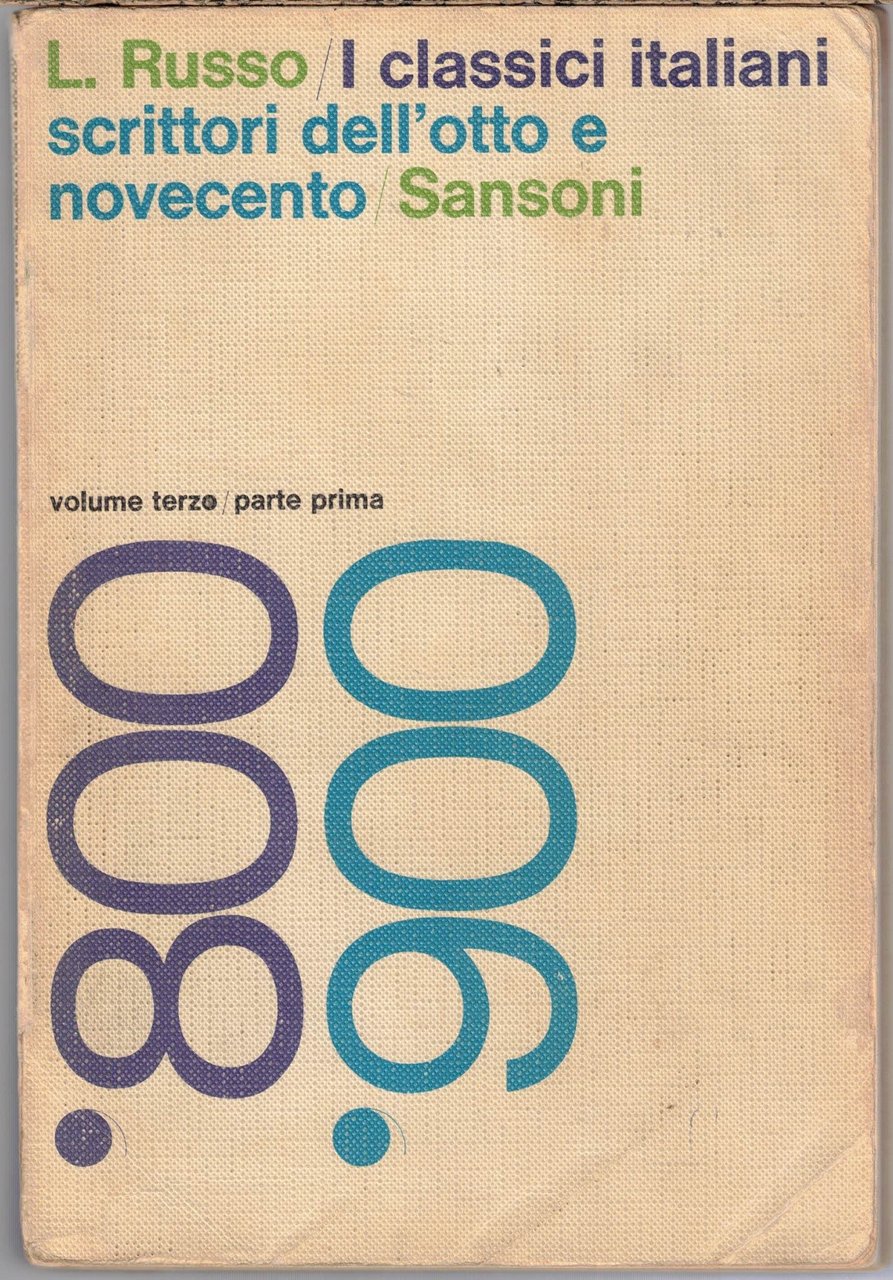 Luigi Russo, I classici italiani, a cura di F. Figurelli et al., G. C. Sansoni Editore, Firenze 1966-1969, 3 voll., 6 tomi, pp. totali XIX, 3.940, cm 20, br. ed. Volume primo: Dal Duecento al Quattrocento, a cura di F. Figurelli, R. Ramat, E. Bonora, L. Russo, C. Muscetta, nuova ed. riveduta e accresciuta (tomo I, 1967, pp. 750 – tomo II, 1966, pp. 744-1283). Volume secondo: Dal Cinquecento al Settecento, a cura di L. Russo, W. Binni, G. N. Orsini, G. Marzot, M. Fubini, G. Bettalli, P. Villa, nuova ed. riveduta e accresciuta (tomo I, 1968, pp. XIX, 659 – tomo II, 1967, pp. 1049). Volume terzo. Scrittori dell’Otto e Novecento (tomo I. L’Ottocento, a cura di Luigi Russo, 1969, pp. 692 – tomo II. Scrittori dell’Otto e Novecento, a cura di Riccardo Rugani, 1967, pp. 692). Tracce d’uso molto marcate sul primo tomo del secondo e del terzo volume, tracce d’uso ordinarie sui due tomi del primo volume, sgualciture e alcune sottolineature e annotazioni a lapis, tenue brunitura della carta, ben conservati i secondi tomi del secondo e del terzo volume. Nel complesso comunque insieme in conservazione accettabile e di piena fruibilità.