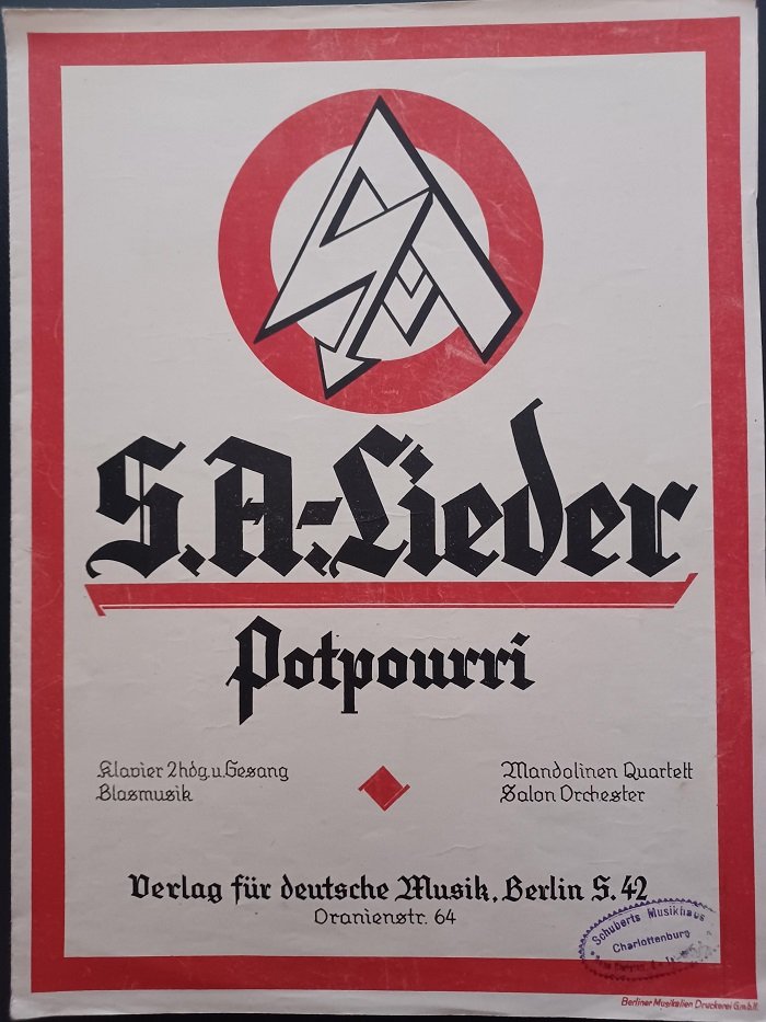 Großformatiges Notenheft mit Liedtexten, Klaviersatz von Max Schröder. Enthält folgende Lieder mit Text und Notensatz: Märkische Heide / Als die goldne Abendsonne / Es zog ein Hitlermann / Wir sind die Sturmkolonnen / Du kleiner Tambour / Brüder in Zechen und Gruben / Es pfeift von allen Dächern / Volk ans Gewehr. Das Lieder-Potpourri für die SA-Männer erschien zeitgleich auch auf einer Schallplatte. Hier liegen die Liedtexte mit Notenbild vor. Äußerst seltene Publikation aus dem frühen Nationalsozialismus!