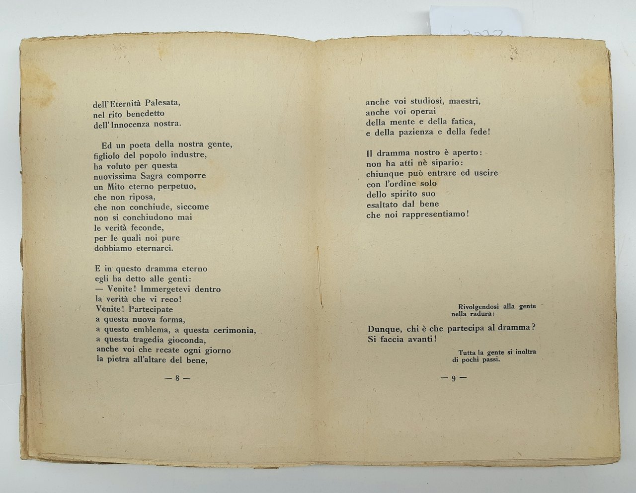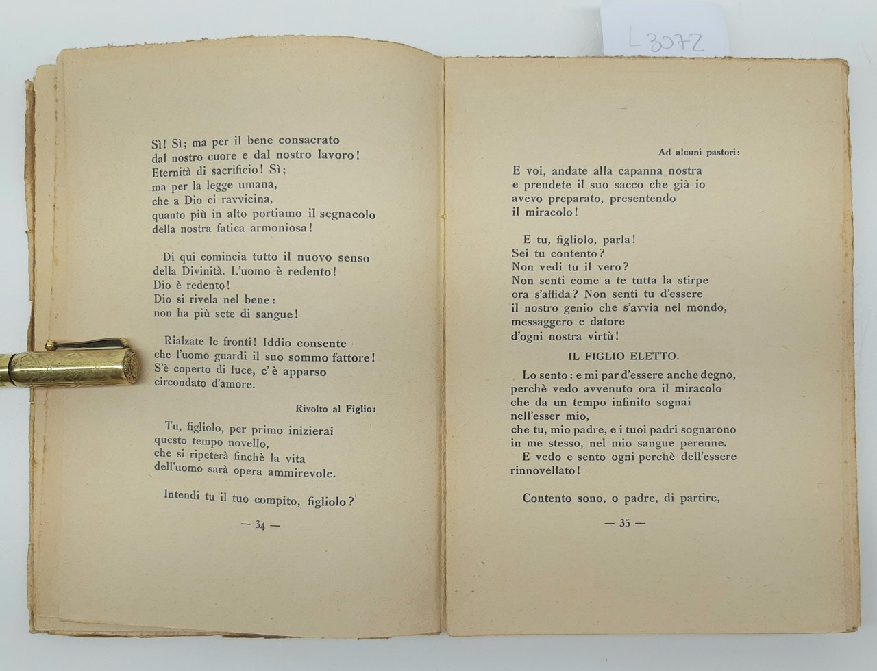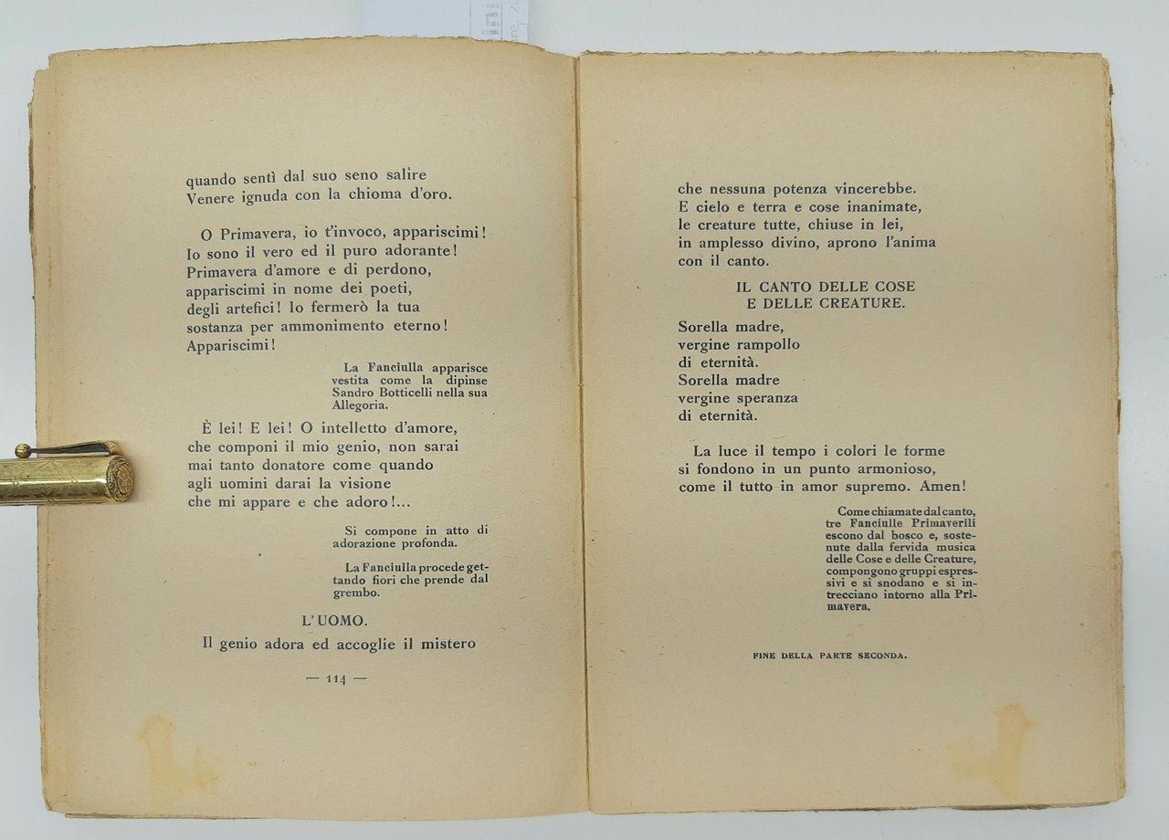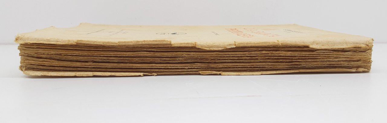 legatura morbida editoriale in precarie condizioni con aloni fioriture ai piatti e al dorso, dorso con mancanze al margine inferiore, piccoli strappi ai margini dei piatti, tagli irregolari bruniti con fioriture, uno strappo di centimetri 4 al margine inferiore tra piatto anteriore e dorso, firma di possesso al pianto anteriore all'antiporta e al frontespizio, timbro di possesso all'antiporta e al frontespizio, legatura molto allentata, fioriture alle pagine interne che non impediscono la lettura forniture alle pagine, numero pagine 157 dimensioni cm 19,5 x 14