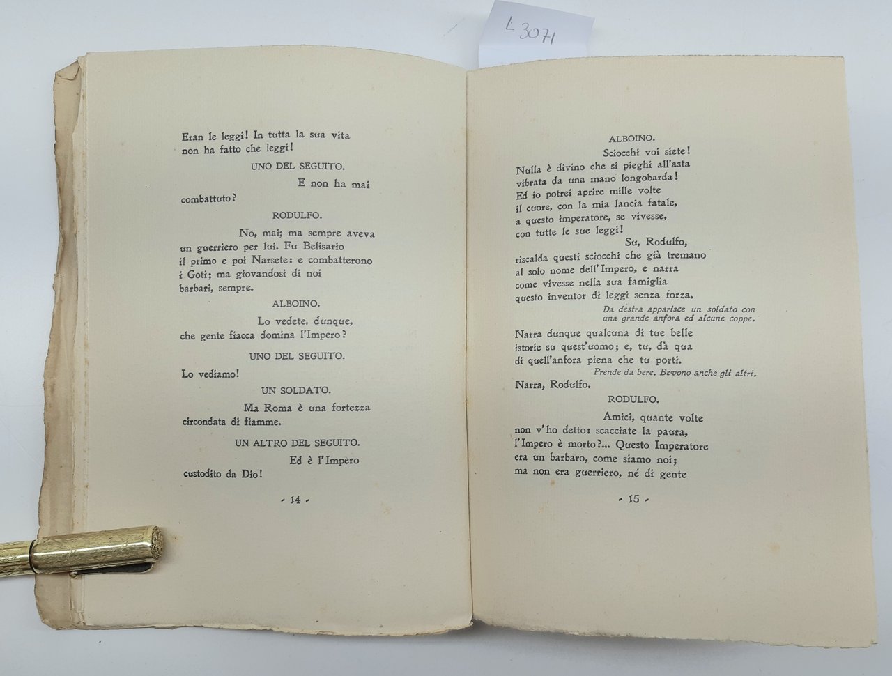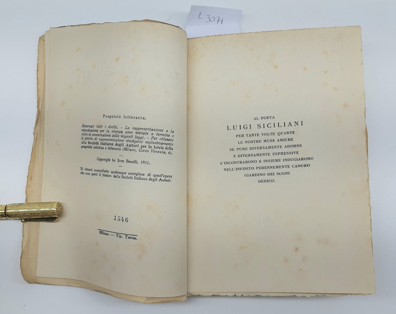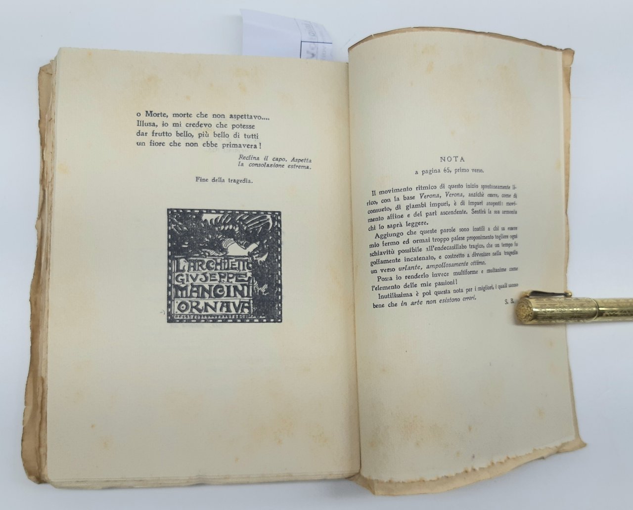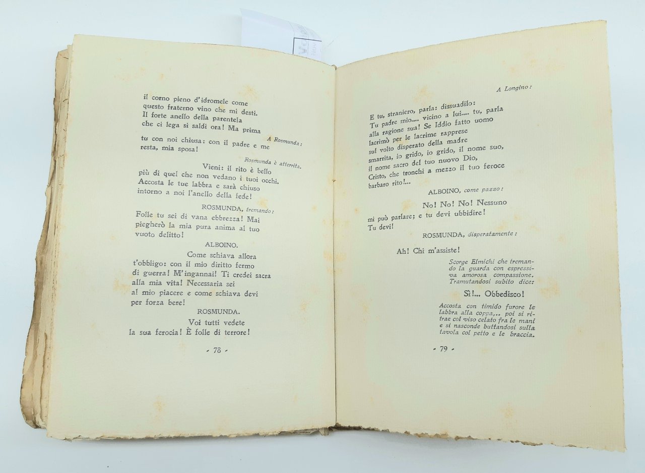 legatura morbida editoriale brunita con aloni e macchie ai piatti e al dorso, pieghe e strappi ai margini dei piatti, dorso brunito con abrasioni e piccoli strappi ai margini, firma di possesso al piatto anteriore all'antiporta e frontespizio, timbro di catalogazione all'antiporta e timbro di possesso al frontespizio, fioriture diffuse alle pagine interne che non impediscono la lettura, tagli irregolari bruniti con fioriture diffuse, legatura leggermente allentata, all'interno illustrazioni nel testo di Mancini, numero pagine 170 dimensioni cm 20 x 14,5