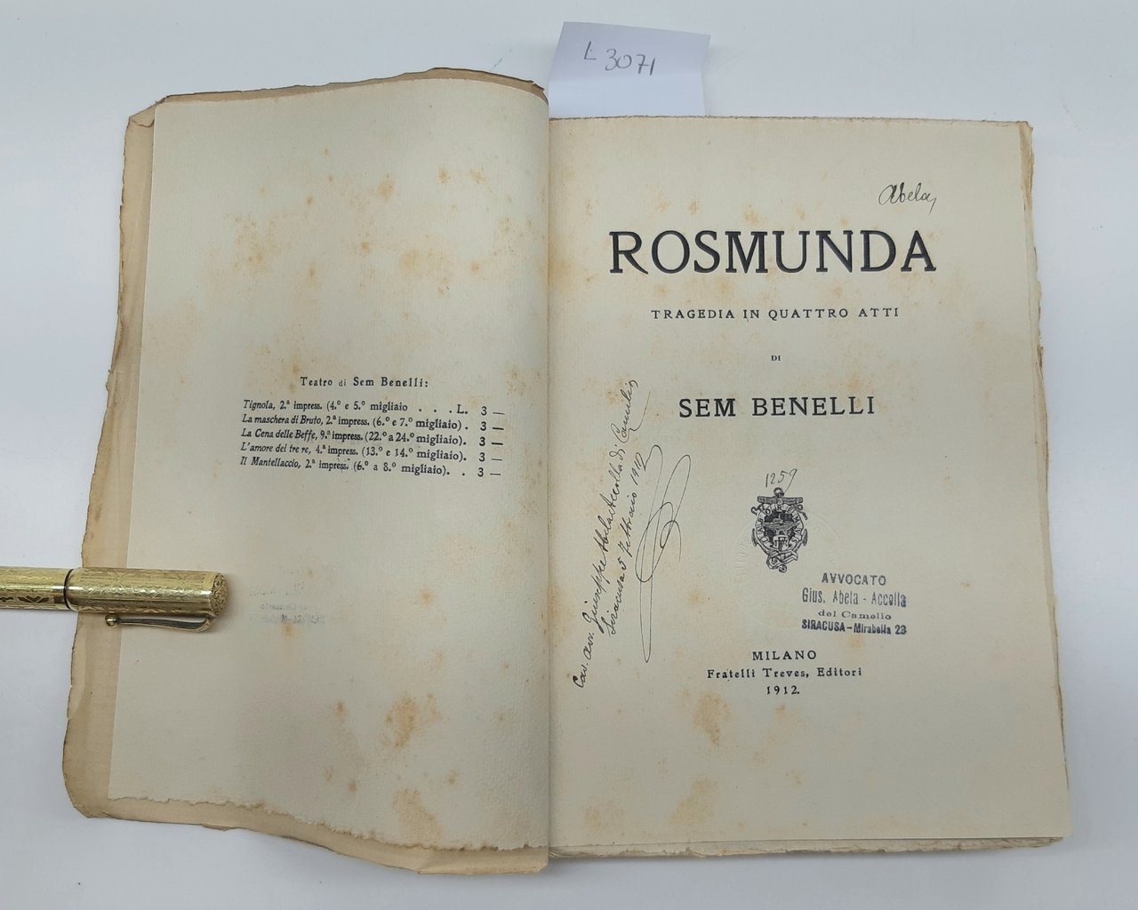 Libro facente parte della biblioteca privata Abela discendenti del patrizio Giuseppe Abela che con il fratello Gaetano Abela ed a Daniele Caporosso, a Bartolomeo Sestini furono i fondatori della carboneria a Siracusa (1817). Con loro interagiva la massoneria che aveva sede in casa del cavaliere Vincenzo Oddo Alla Turba (v. Roma). Da loro partì la miccia, racconta Oreste Reale, che fece scoppiare i moti del 1820 che costrinsero il Borbone a concedere la costituzione. I fratelli Abela intanto, che erano stati scoperti, imprigionati e torturati, riacquistarono la libertà. Gaetano Abela fu nominato generale e incaricato di propagandare nella Sicilia orientale il programma del governo siciliano. Ma nel 1824 Gaetano e Giuseppe Abela vennero di nuovo arrestati e condannati dalla polizia borbonica, e nel 1826 Gaetano fu fucilato a Palermo