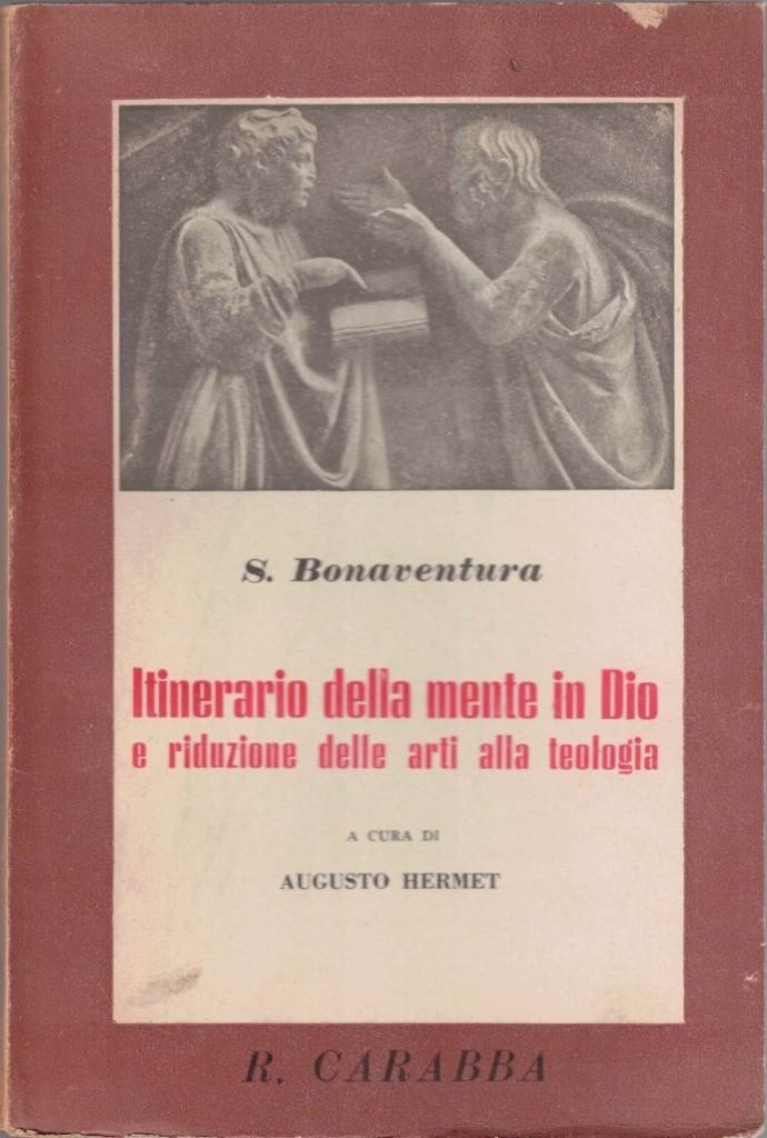 S. Bonaventura (Bonaventura da Bagnorea), Itinerario della mente di Dio e Riduzione delle arti alla teologia, traduzione e introduzione di Augusto Hermet, R. Carabba Editore, Lanciano 1933, pp. 139, cm 19, br. ed. Collana Classici del pensiero e dell’educazione, vol. 23. Indice: Introduzione di Augusto Hermet – Cenno bibliografico – Itinerario della mente di Dio – Riduzione delle arti alla teologia. Una piccolissima abrasione al margine della prima di copertina, minima brunitura della carta, per il resto perfetto.