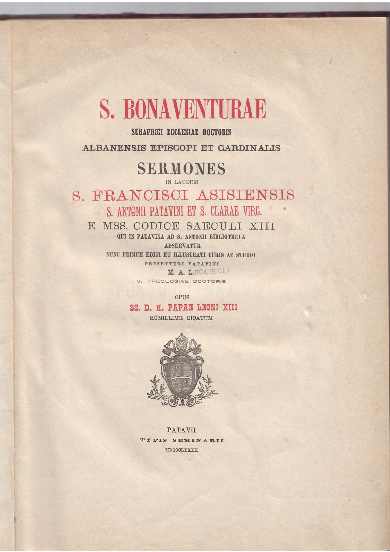 S. BONAVENTURAE SERAPHICI ECCLESIAE DOCTORIS ALBANENSIS EPISCOPI ET CARDINALIS SERMONES IN LAUDEM S. FRANCISCI ASISIENSIS S. ANTONII PATAVINI ET S. CLARAE VIRG. E MSS. CODICE SAECULI XIII