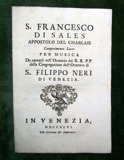 S. Francesco di Sales, Appostolo del Chablais. Componimento sacro per musica da cantarsi nell' oratorio dei RR. padri della Congregazione dell' Oratorio di S. Filippo Neri di Venezia
