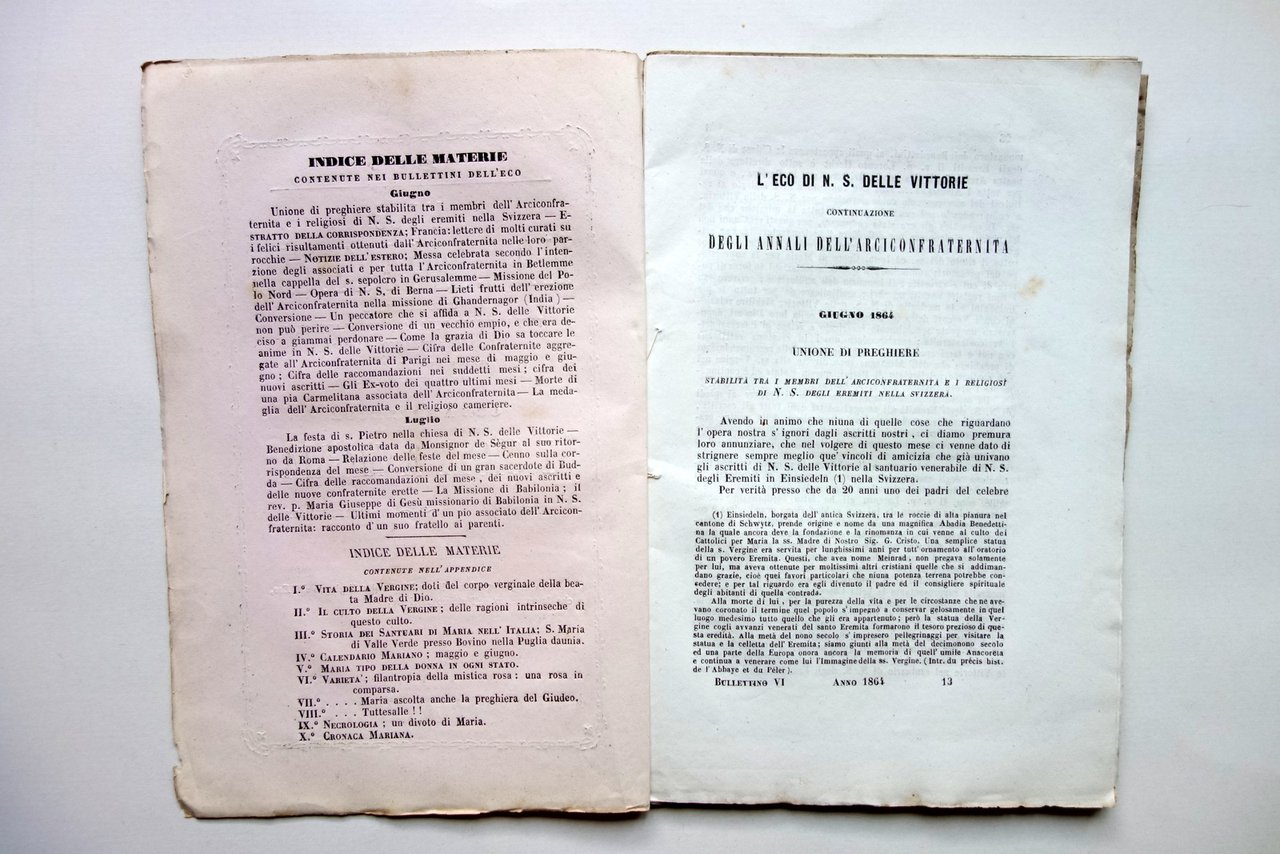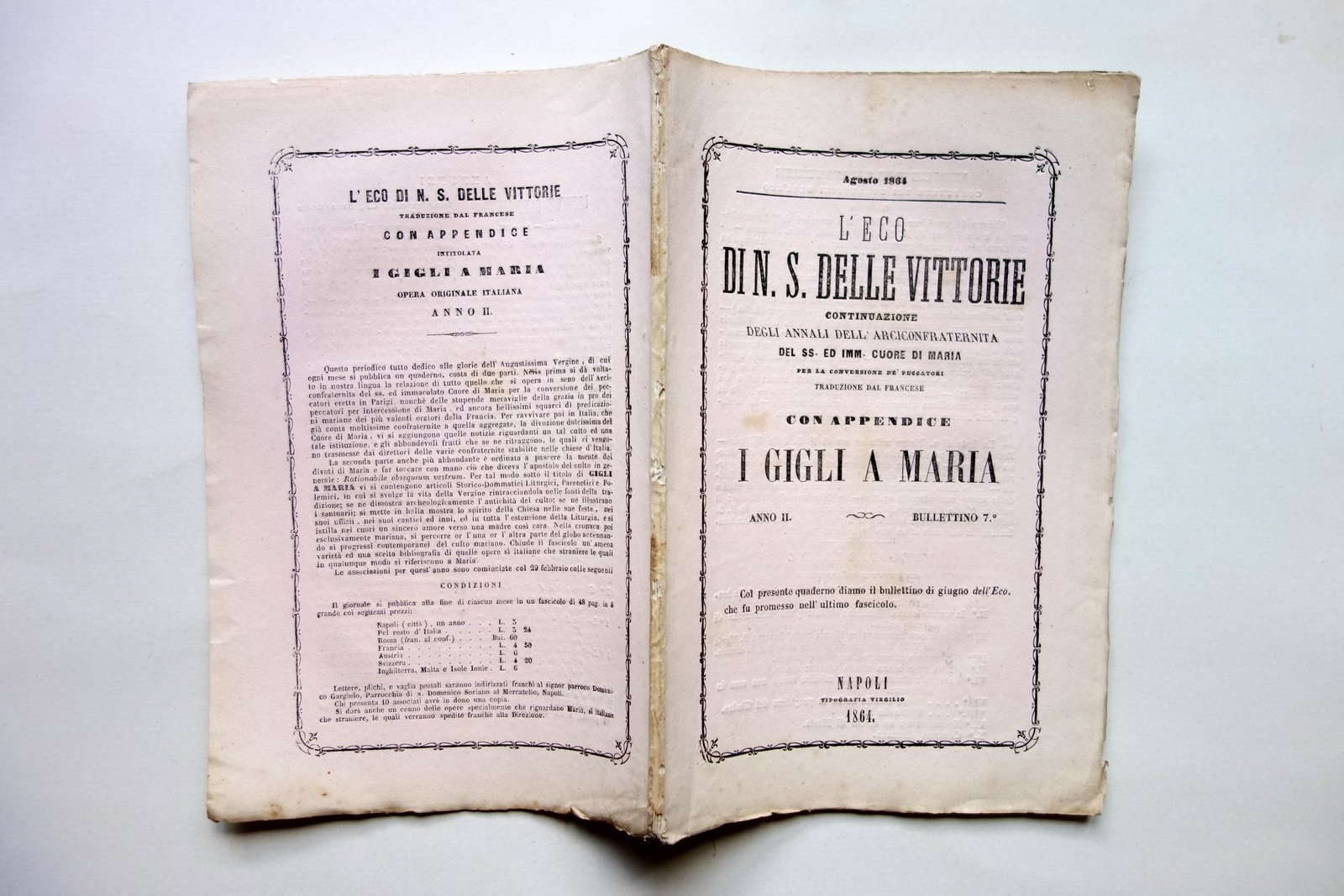 Bollettino, S. Maria di Valle Verde presso Bovino nella Puglia Daunia" in "L'Eco di N. S. delle Vittorie" continuazione degli annali dell'arciconfraternica del SS. ed Imm. Cuore di Maria per la conversione dei peccatori [.]" anno II - bullettino 7° agosto 1864 Tip. Virgilio, Napoli 1864; cm 24,5x16; pp. da 97 a 236 (esemplare autonoma con numerazione progressiva annuale); brossura ed. d'attesa. Bollettino completo. Condizioni di conservazione Esemplare in buone condizioni, ancora intonso (mai sfogliato), con lievi marginali accenni di ingiallimento alla brossura e alcune minime bruniture. Interni buoni. Bollettino completo. Per maggiori dettagli sul contenuto vedi foto indice. Ancora intonso (mai sfogliato). L'articolo sopra indicato su S. Maria della Valle Verde è di 4 pagine. OPEB.5522 N "