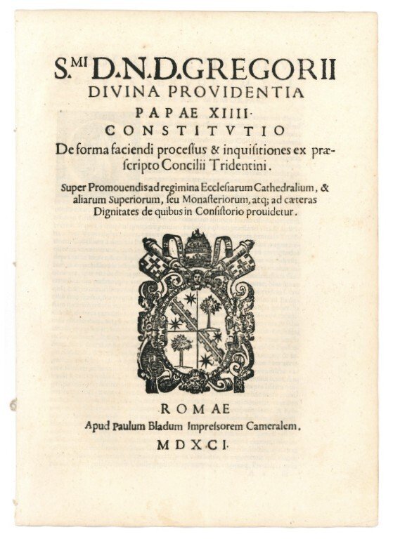 S.mi D.N.D. Gregorii divina providentia papae XIIII Constitutio de forma faciendi processus & inquisitiones ex praescripto Concilii Tridentini. Super promouendis ad regimina ecclesiarum cathedralium, & aliarum superiorum, seu monasteriorum, atque ad cateras dignitates de quibus in Consistorio providetur.