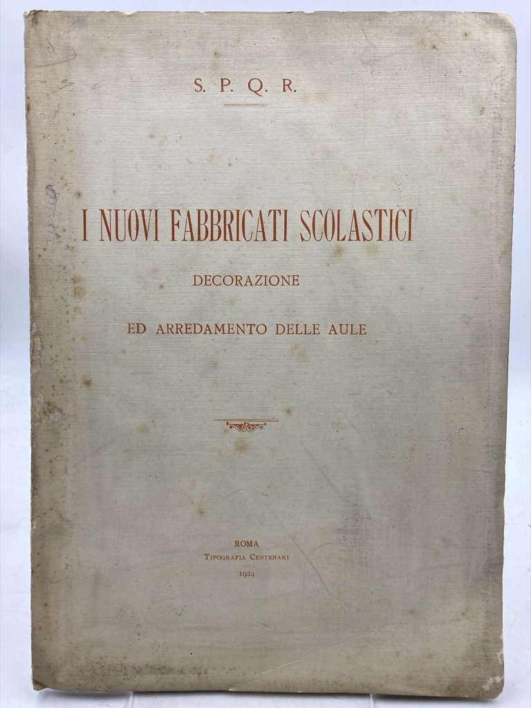 Brossura editoriale a stampa (difetti), cm 28x20, pp 24 + 43 tavole in nero. Esemplare da studio, con difetti: tracce d'uso e piccole mancanze sul piatto anteriore della brossura (morsure di anobii), fioriture e piccoli difetti da aderenza sulle tavole patinate (di modesta entità, senza perdita di immagine). Breve resoconto degli interventi effettuati dall’amministrazione romana nell’immediato primo dopoguerra nell’ambito dell’edilizia scolastica, con vedute e piante del Liceo Mamiani progettato da Vincenzo Fasolo in viale delle Milizie (tavole 1-6), della Scuola 4 Novembre progettata da Augusto Antonelli in via Volta (9-18), del Padiglione con 6 aule in via del Pigneto (19-21), e progetti e piante per le scuole da costruire a Tor di Nona (22 e 23), nel quartiere Appio (24-26), a S. Saba (27 e 28), S. Egidio (29 e 30), in via Bixio (31-33), in Piazza d’Armi (34-36), in via Ostiense (37 e 38); la seconda parte del testo e le tavole 39-43 sono relative agli arredi e decorazioni delle aule ideata da Raffaele de Vico.