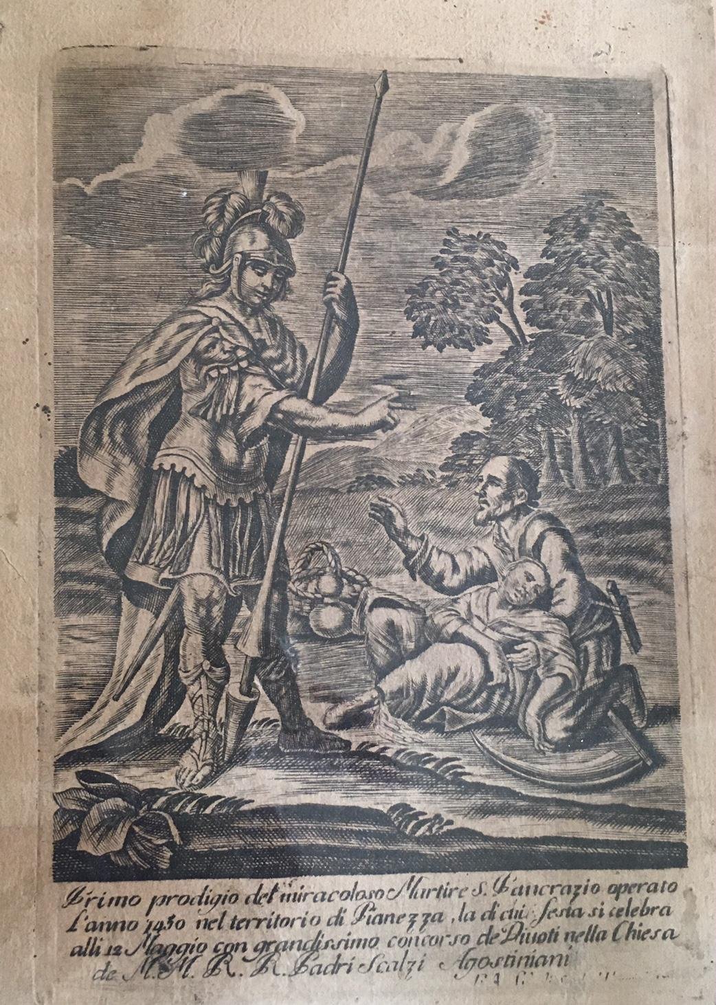 >incisione in rame. mm. 18x10. Titolo su 4 righe lungo il margine inferiore: "Primo prodigio del miracoloso Martire S. Pancrazio operato l'anno 1450 nel terriorio di Pianezza, la di cui festa si celebra allì 12 Maggio con grandissimo concorso de Divoti nella Chiesa de M.M.R.R. Padri Scalzi Agostiniani. Rara incisione uniformemente brunita.