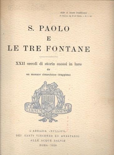 in 4°, pp. XXI, 162, 24 tavv. f.t., bross. edit. ill. Storia delle Tre Fontane dal II secolo a.C. fino all'arrivo dei monaci Cistercensi nel 1140, documentata da ricerche sui Codici Vaticani, il Liber Pontificalis, il Regesto del Monastero, bolle pontificie ed altro; con 24 tavv. f.t. in seppia, tra cui 1 a colori e 1 ripiegata. Manca la sovracop., per il resto ottimo. 172-40