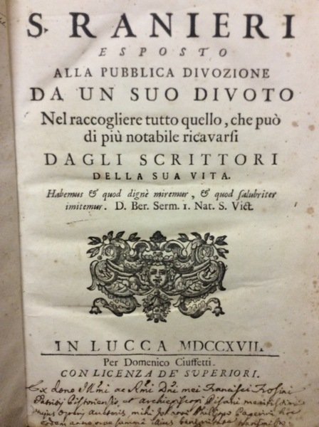 S. RANIERI ESPOSTO ALLA PUBBLICA DIVOZIONE DA UN SUO DIVOTO. - Nel raccogliere tutto quello, che può di notabile ricavarsi dagli scrittori della sua vita.