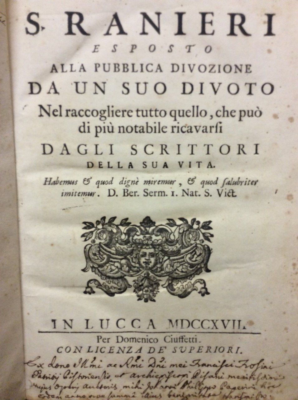 In-8 gr. (mm. 271x192), p. pergam. coeva (con spacco), pp. 182,(2). La vita del santo è qui spiegata in sonetti, ognuno messo di fronte alla sua prosa. La introduce una erudita Prefazione in cui l'A. annovera gli antichi pregi della città e della chiesa di Pisa. "Edizione originale".Protettore di Pisa, l'eremita Ranieri (1128-1160), dopo una giovinezza mondanamente trascorsa si dedicò a opere di penitenza; fu due volte in pellegrinaggio a Gerusalemme quindi si ritirò nel monastero di S. Vito a Pisa. Così Diz. Treccani,X, p. 138.Cfr. Melzi,III, p. 24 che cita erroneamente come data il 1719: In fine leggonsi due sonetti in lode di quest'opera, il primo de' quali.. esprime con le lettere iniziali d'ogni suo verso il nome dell'autore mentovato "Francesco Frosini" - Moreni,I, p. 401.Lunga postilla a penna al frontespizio; con qualche uniforme arrossatura e lievi fioritura ma discreto esemplare.