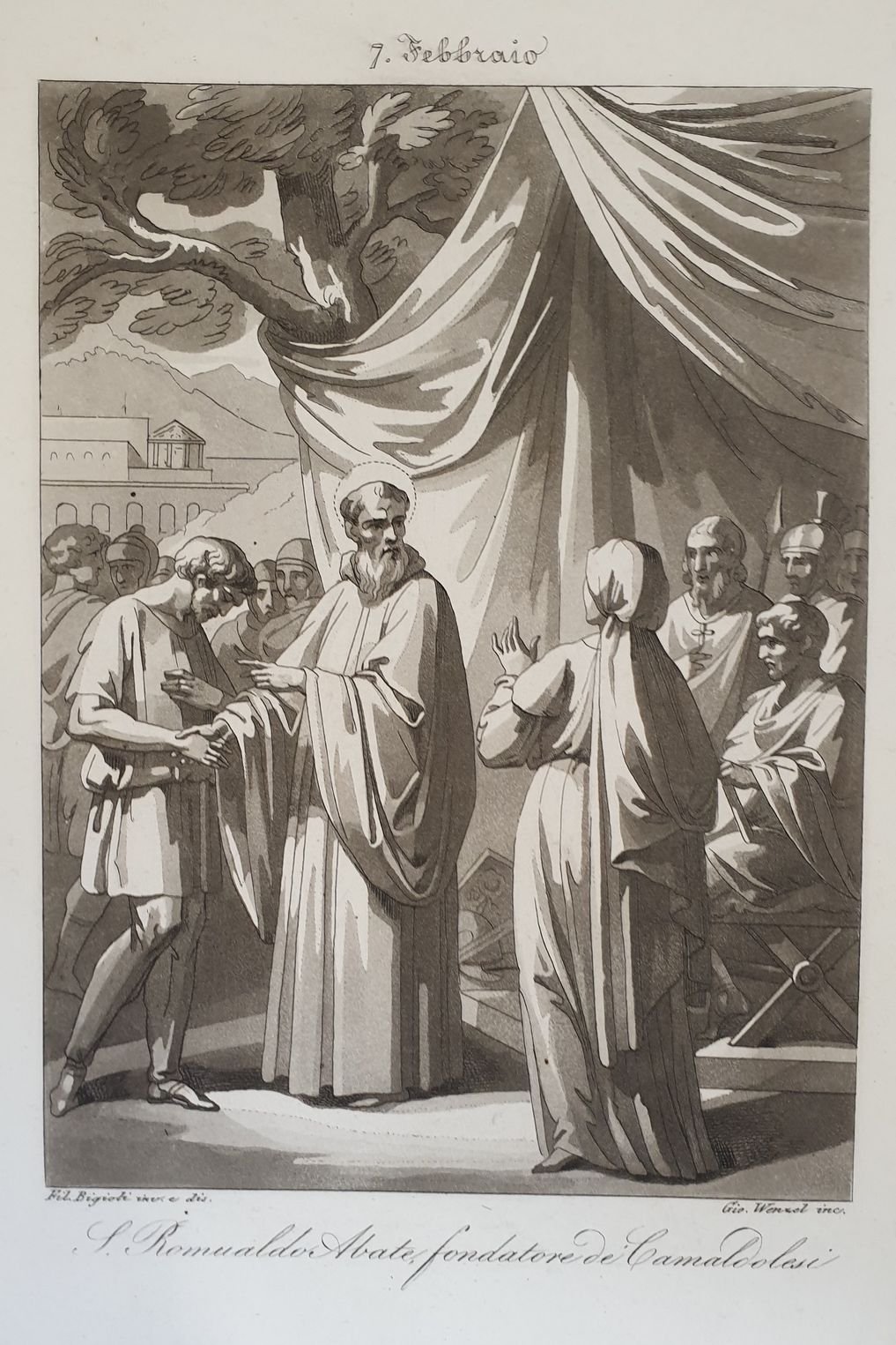 Incisione all'acquatinta del 1843 che mostra San Romualdo Abate (7 febbraio).<BR>Autore: Gio. Wenzel su disegno di Filippo Bigioli Atlante: Compositions artistiques pour tous les jours de l'annee Data: 1843 Dimensioni foglio: mm 272x206. Dimensione incisione al margine: mm 180x133. In buone condizioni.Nice acquatint of 1843 featuring San Romualdo Abate (7 february). Author: Gio. Wenzel after Filippo Bigioli Atlas: Compositions artistiques pour tous les jours de l'annee Date: 1843 Size of the page: mm 272x206. Size in the print: mm 180x133. In good conditions.