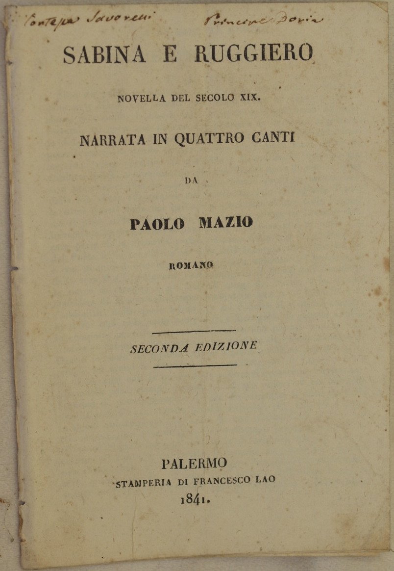 In 8. Dim. 19x12,5 cm. Pp. 16. Rara seconda edizione del 1841 di questa novella dello scrittore romano vissuto nel XIX secolo Paolo Mazio. L'opera è priva di legatura ma completa. Firma di possesso al frontespizio. In buone condizioni. Copertina assente. Legatura in discrete condizioni. All'interno le pagine si presentano in buone condizioni con fioriture e macchie. Piegatura verticale. Scarce second edition of 1841 of this short novel by the roman writer who lived in the XIX century Paolo Mazio. The work is boundless but complete. Signature of the ex owners in the title page. In good conditions. Cover is missing. Binding in fair conditions. Inside pages are in good conditions with foxings and stains. Vertical folding.