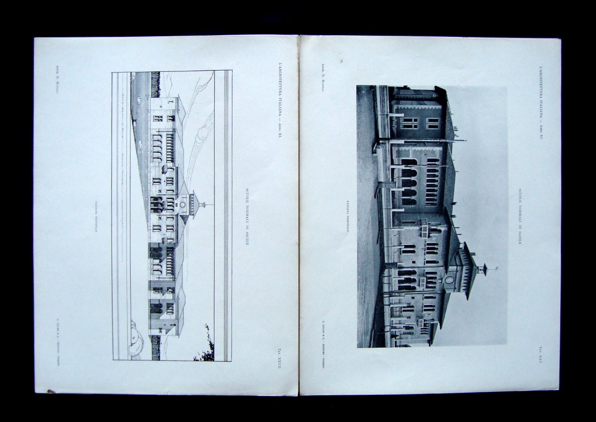 Periodico, L'Architettura Italiana" Periodico mensile di Costruzione e di Architettura pratica Anno XI - N. 7 Torino 1 Aprile 1916 Società Italiana di Ed. Artistiche C.Crudo & C.; Tip.Subalpina, Torino, 1916; cm 35,5x26, pag. da 65 a 72 sciolte con ill. fot. e disegni b/n n.t.+ 4 tavole b/n f.t. Rivista completa. Condizioni di conservazione Esemplare in buone condizioni con tracce d'uso, margini con bruniture e alcuni piccoli strappetti. Rivista completa. "Scuole normali di Sacile"; articolo di cinque pagine con ill fot. , disegni e 4 belle tavole fotografiche fuori testo(Arch. D.Rupolo). SC03.D16568 blu "