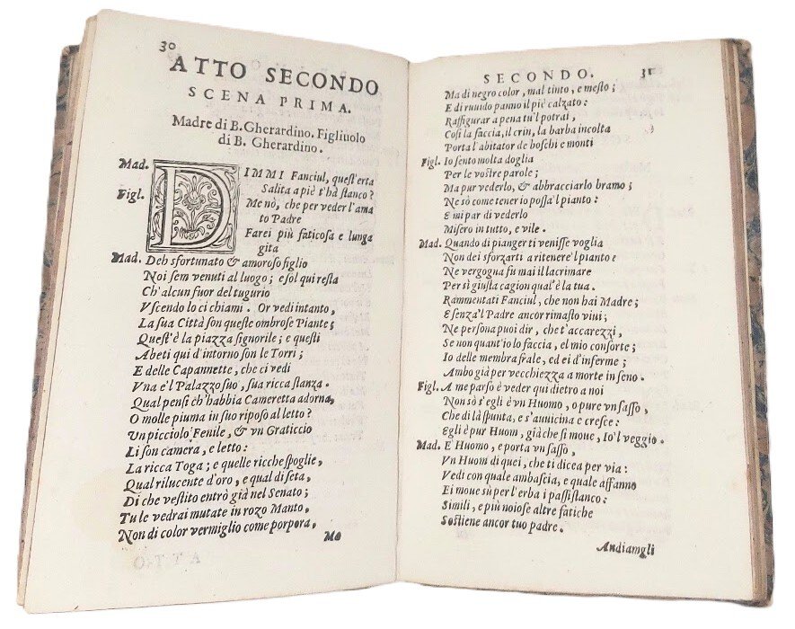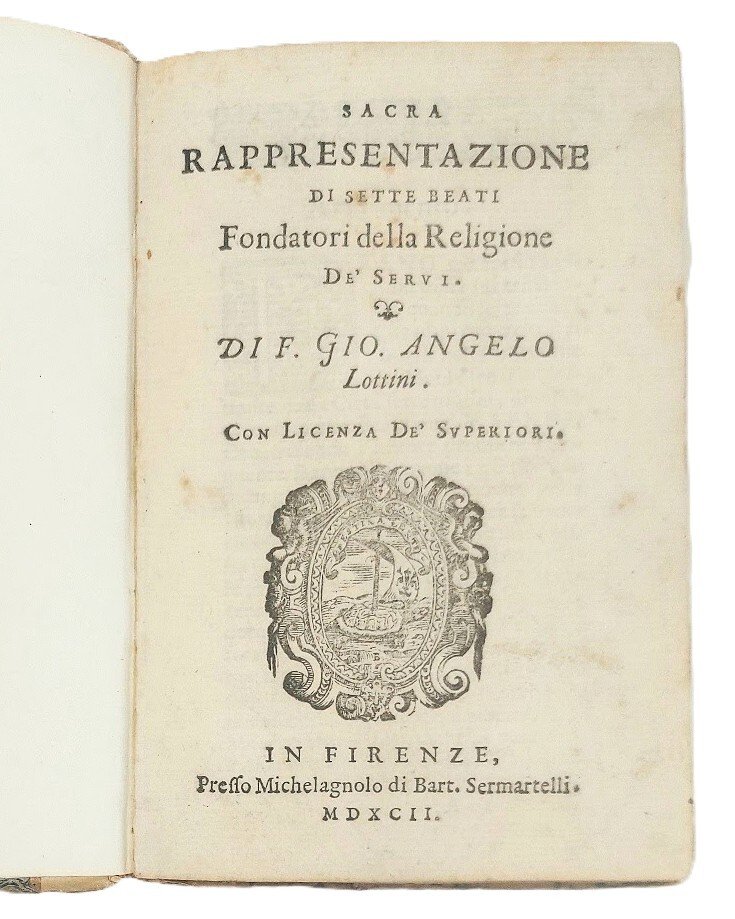 >in-8, pp. 112, leg. settec. cart. Impresa tipogr. sul tit., iniz. e fregi xilogr. Prima edizione di questa ''pièce'' in cinque atti, in versi sciolti endecasillabi e settenari; la scena si svolge sul Monte Senario, presso Firenze, dove i Sette Beati, che sono anche tra i personaggi della rappresentazione, fondarono nel 1233 il celebre monastero e, di conseguenza, l'Ordine dei Serviti, o Servi di Maria. Testo assai raro: il Cioni (Bibliografia delle Sacre Rappresentazioni, Firenze, 1961, p. 305) dimostra di non averlo visto, infatti, pur elencandolo insieme ad altre produzioni dello stesso autore, erra nel titolo e nel numero delle pagine. Il fiorentino padre Lottini, servita, morto nel 1629, compose almeno altre quattro sacre rappresentazioni ed una tragedia. Bell'esemplare (qualche macchia d'inchiostro e lievi ingialliture). Cioni, op. cit. p. 305. Moreni, Bibliogr. Toscana I, 527 (anch'egli erra, riportando nel titolo ''Fiorentini'' in luogo di Fondatori). Allacci 717. Soleinne IV, 4038. Clubb 561. Regenstein 374. BMC 394. Adams