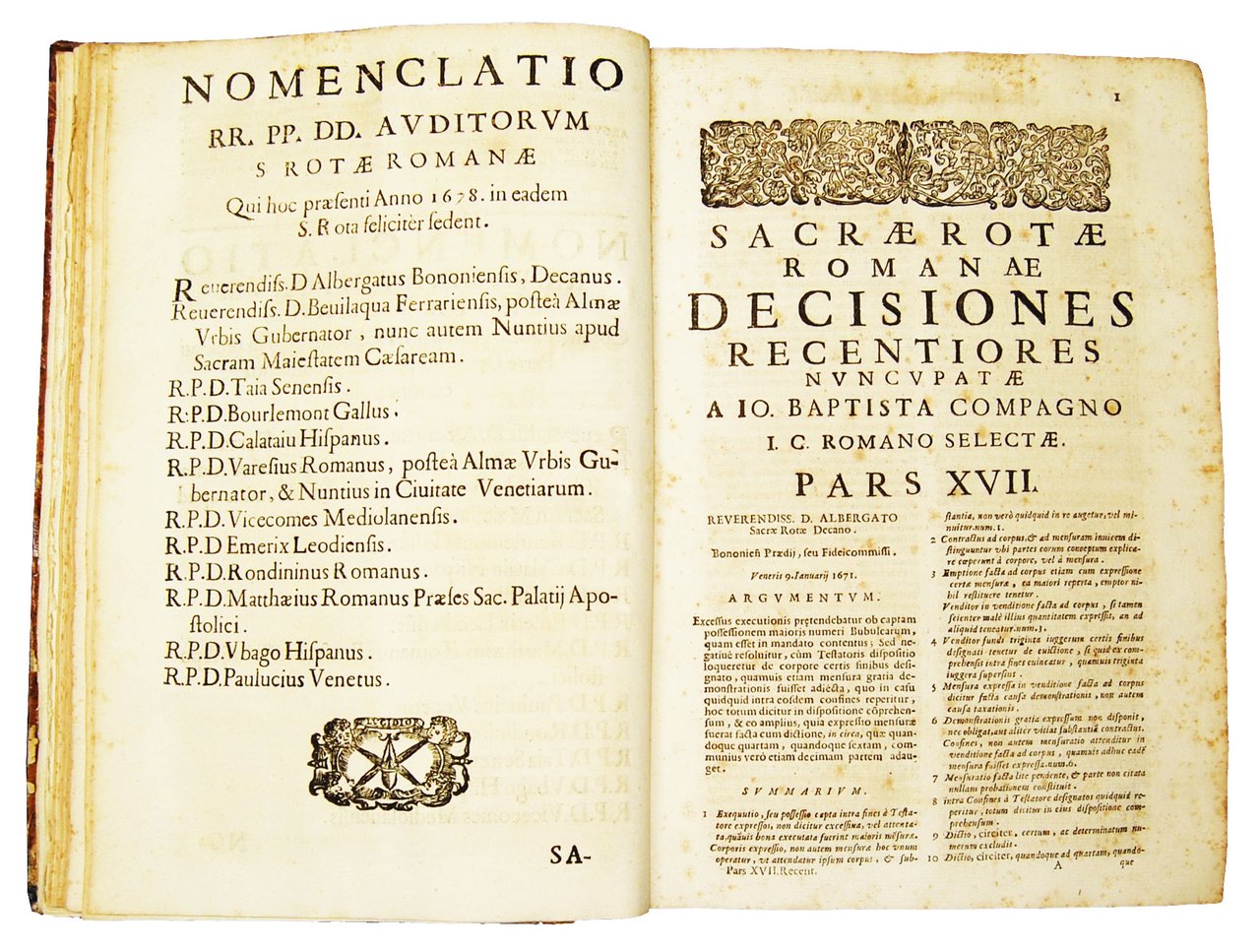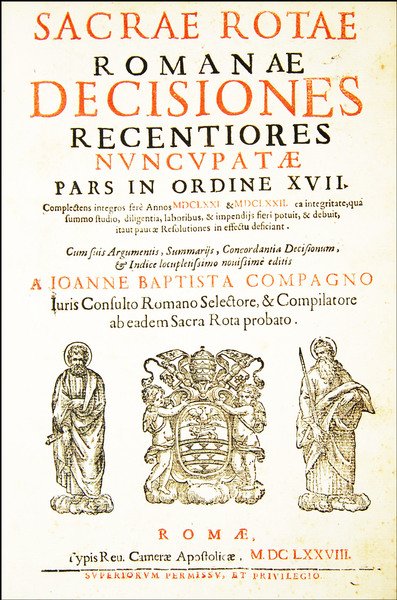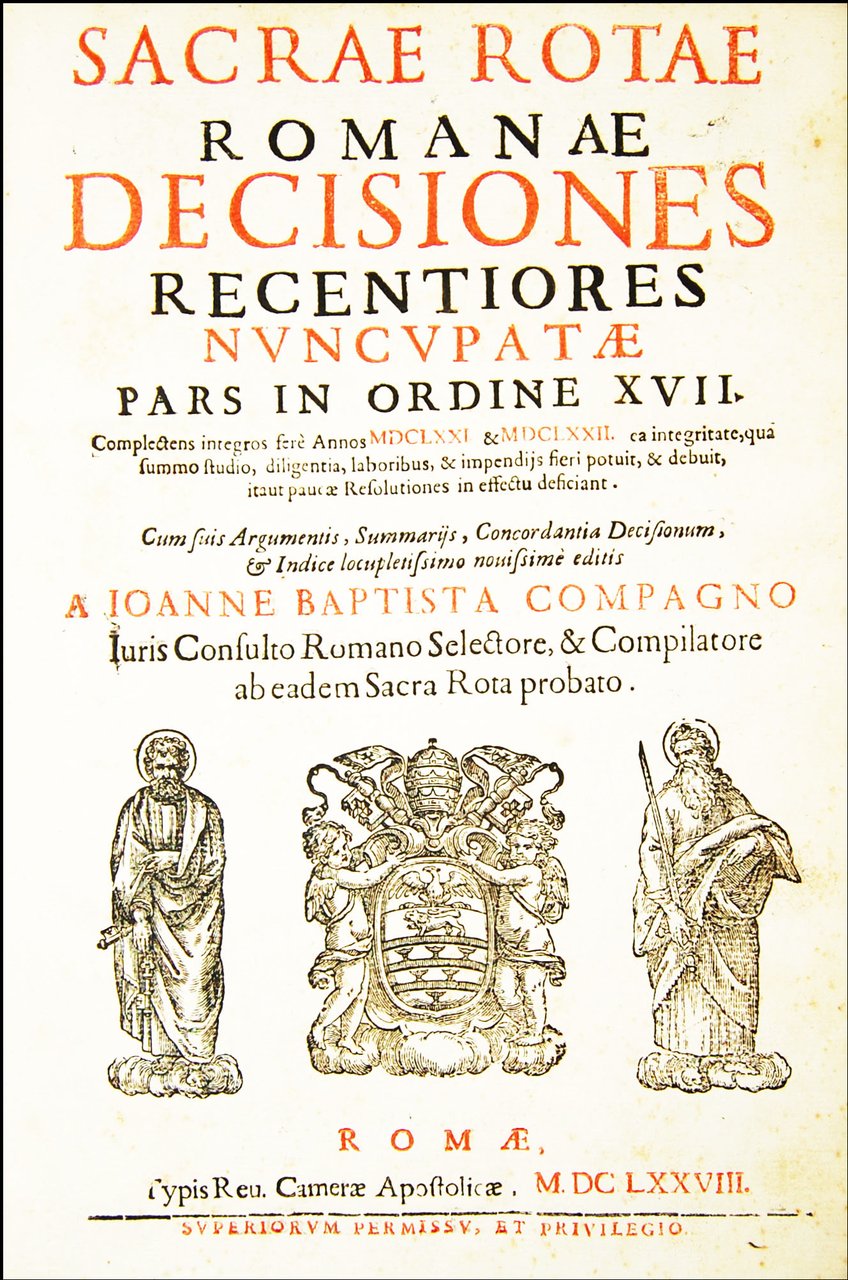 Sacrae Rotae Romanae Decisiones recentiores nuncupatae pars in ordine 17. Complectens integros fere annos 1671. & 1672. […] Cum suis argumentis, summarijs, concordantia decisionum, & indice locupletissimo nouissime editis a Ioanne Baptista Compagno iuris consulto Romano selectore, & compilatore ab eadem Sacra Rota probato.
