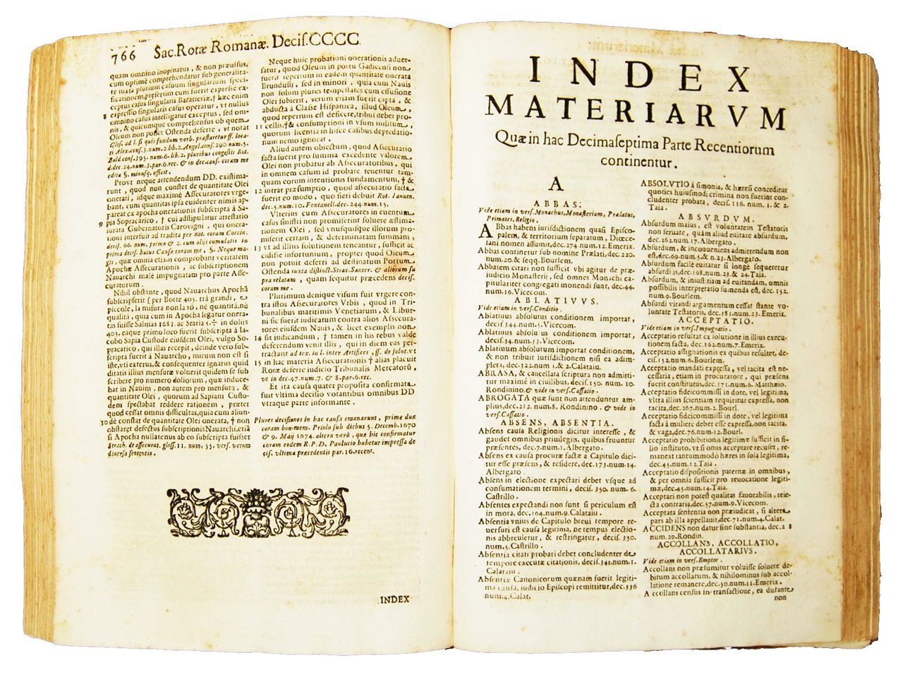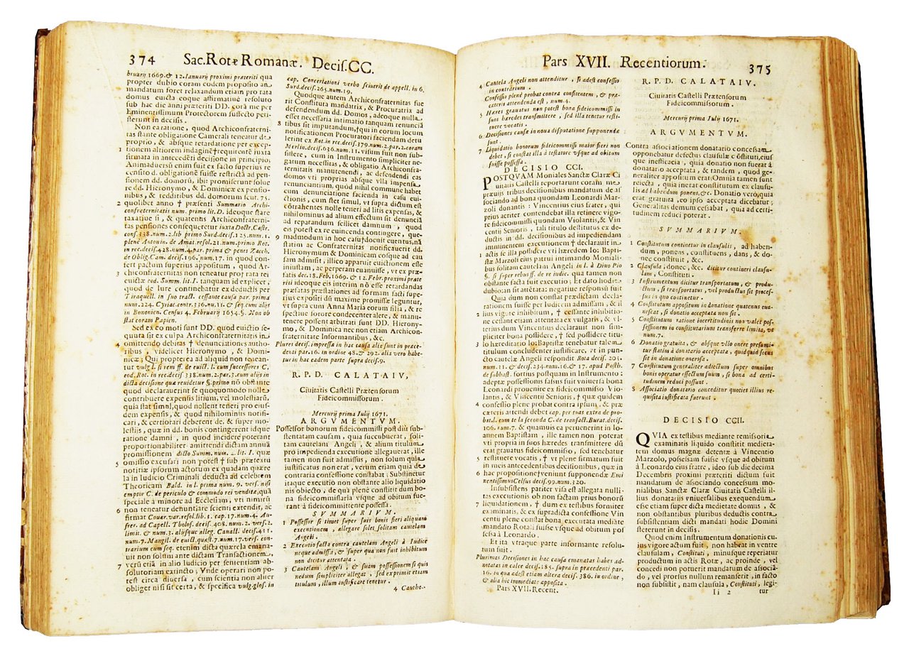 Folio, 326x220 mm, half leather binding with marbled paper at boards, gilt title at spine; pp. [72], 766, [210]. Title-page in red and black types, with xyl. coat of arms of Pope Innocent XI 38/5000 between the figures of Saints Peter and Paul. At half-title: Sacrae rotae romanae decisiones rentiores pars in ordine 17. Two-column layout. A LARGE COLLECTION OF 400 DECISIONS ARRANGED FROM 1671 TO 1672, INCLUDING SOME MORE RECENT. PARS XVII OF THE PONDEROUS SET OF VOLUMES OF ROTA'S “DECISIONES RECENTIORES” . This work contains 400 decisions: 396 chronologically arranged from 9 Jan. 1671 through 12 Dec. 1672, plus more recent CCCXCVII-CCCC.; it includes also: "Nomenclatio RR. PP. DD. auditorum S. Rotae Romanae coram quibus emanarunt decisiones quae in pre?senti parte decimaseptima Recentiorum continentur": prelim. p. [71], listing twelve auditors: Albergatus, Bevilaqua, Bourlemont, Calataiu, Castrillus, Emerix, Matthaeius, Paulucius, Rondininus, Taia, Ubago, Vicecomes. Then, it includes indexes: "Index materiarum et conclusionum". At end of Index Materiarum: "Ita corrigebat Ioseph Lauretus de Cerchiaria Reatinae Dioec." At last page: errata, register, and colophon, with last line: "Sumptibus Bartholomaei Lupardi Impressoris Cameralis &c.". Ref.: IT\ICCU\NAPE\012238. OCLC, 50255066. Cond.: Traces of use to the binding (light abrasions to paper at boards, very little tear and worm-holes at spine). Presence of foxing. Overall, a good copy.