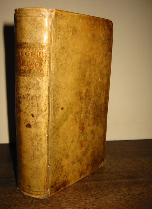 12mo (cm. 16,7), 14 cc.nn., 569 pp. Primo frontespizio inciso e tre ritratti calcografici su tavole f.t. (Paolo III, Giulio III e Pio IV). Legatura coeva in pergamena rigida con titolo oro su tassello dipinto al dorso (tracce d’uso, alcune macchie e piccola mancanza all’angolo inferiore del piatto anteriore). Carte uniformemente ingiallite ma, nel complesso, buono stato di conservazione.