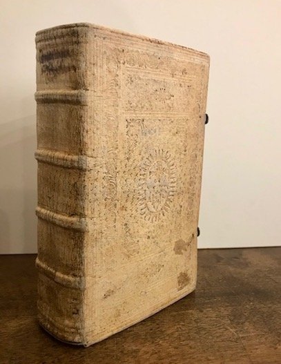 8vo (cm. 17,8). 20 cc.nn., 651(1) pp., 66 cc.nn. (di cui l’ultima bianca). Frontespizio in rosso e nero. Bella legatura coeva in pelle di scrofa con fermagli di chiusura in ferro. Cordoni al ds. e piatti decorati da cornici e fregi a secco con al centro lo stemma dei Gesuiti. Tagli colorati. Antica nota manoscritta sulla carta di guardia libera anteriore. Esemplare in ottimo stato di conservazione. Rara edizione.
