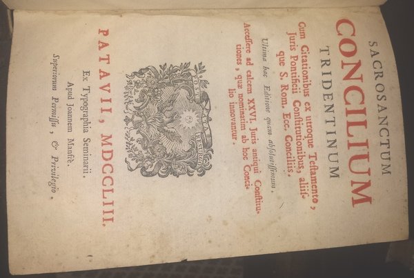 In-8 (17 cm) (16) 550. Frontespizio stampato in rosso e nero. Marca editoriale con Fenice che nasce dalle fiamme in cornice floreale e motto: Post Fata Resurgo. Mezza pelle, con piatti rivestii di carta marmorizzata. Il Concilio di Trento o Concilio Tridentino fu il XIX concilio ecumenico, ovvero una riunione di tutti i vescovi del mondo, per discutere di argomenti riguardanti la vita della Chiesa cattolica. Il concilio di Trento, che in teoria avrebbe dovuto "conciliare" cattolici e protestanti, durò ben 18 anni, dal 1545 al 1563, sotto il pontificato di tre papi. Si risolse in una serie di affermazioni tese a ribadire la dottrina cattolica che Lutero contestava. Con questo concilio venne definita la riforma della Chiesa cattolica (Controriforma) e la reazione alle dottrine del calvinismo e del luteranesimo (Riforma protestante). Fu un concilio importante per la storia della Chiesa cattolica, tanto che l'aggettivo "tridentino" viene usato ancora oggi per definire alcuni aspetti caratteristici della Chiesa cattolica ereditati da questo concilio e mantenuti per i successivi tre secoli, fino ai concili Vaticano I e Vaticano II. Cuffia inferiore e parte del dorso mancante. Per altro buon esemplare