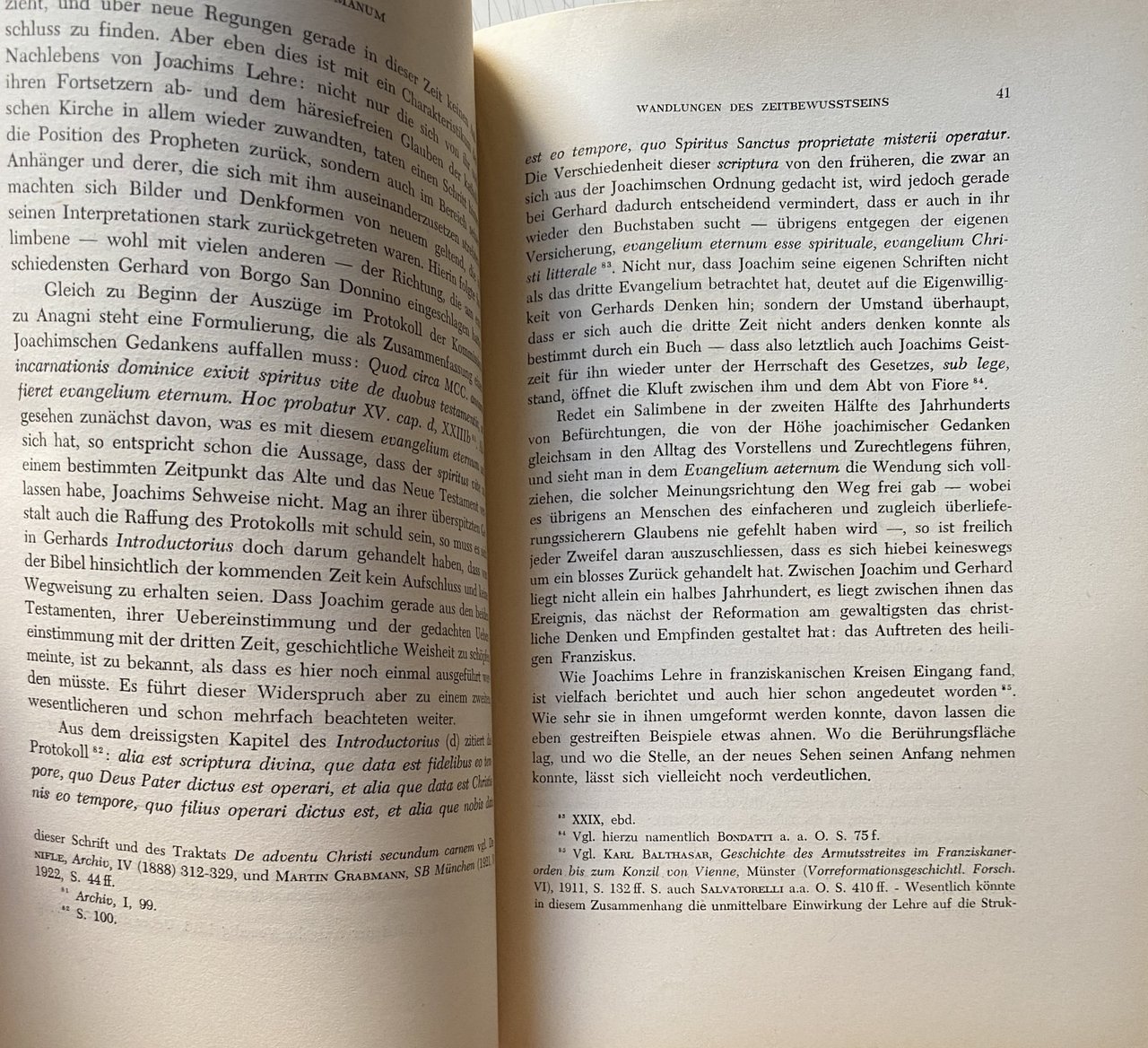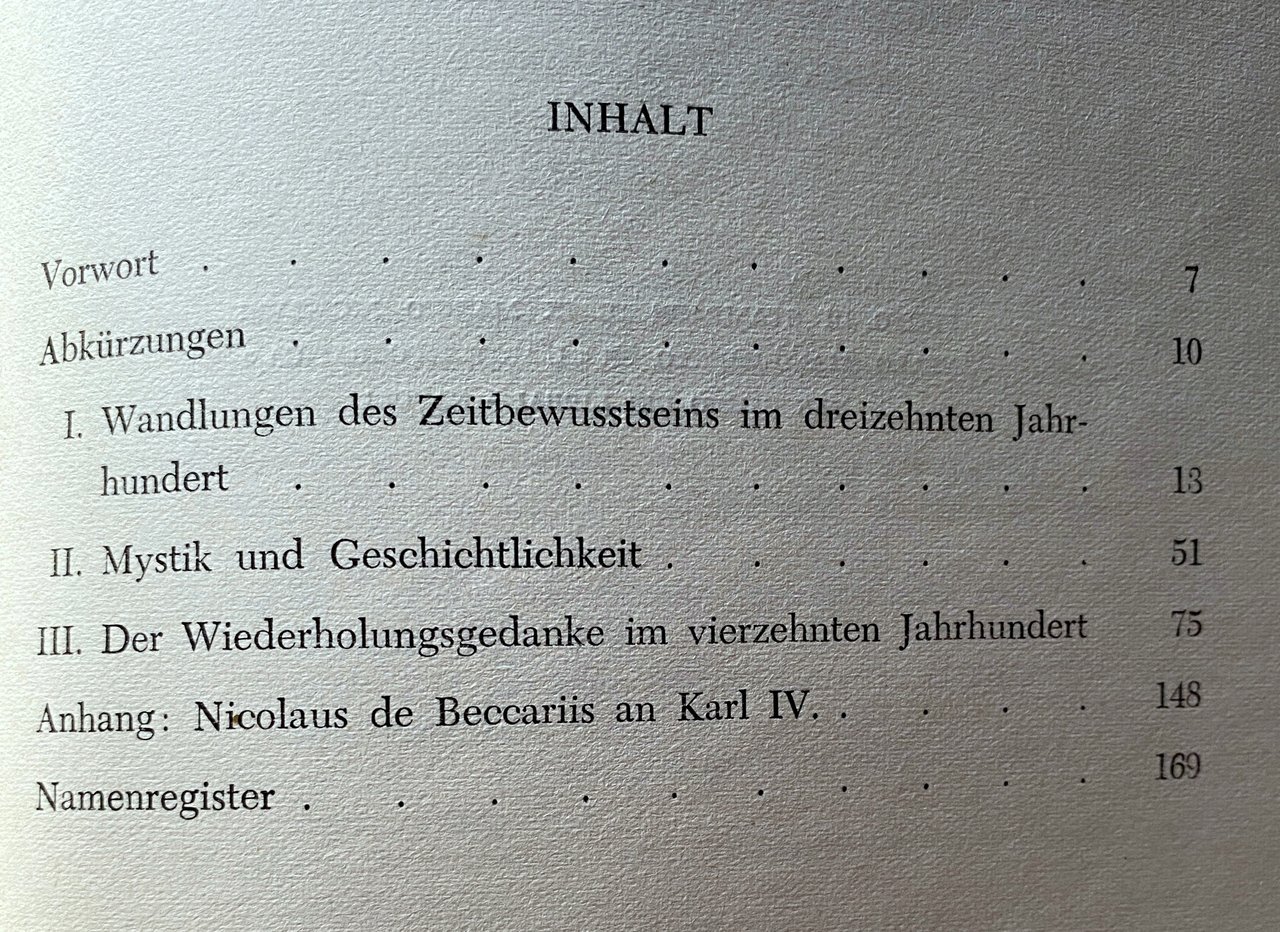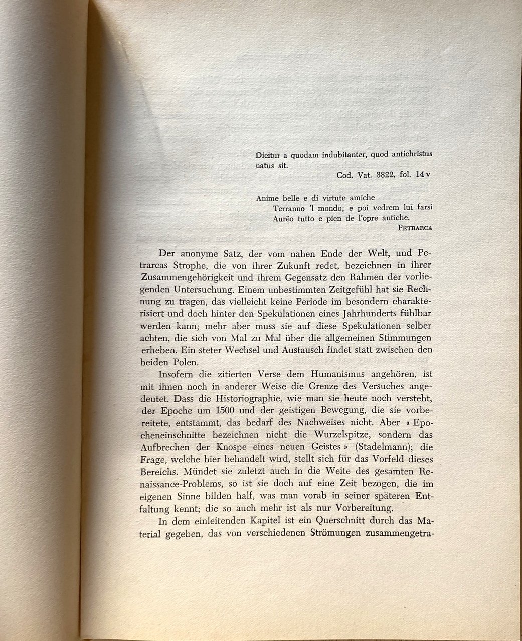 Der anonyme Satz, der vom nahen Ende der Welt, und Petrarcas Strophe, die von ihrer Zukunft redet, bezeichnen in ihrer Zusammengehörigkeit und ihrem Gegensatz den Rahmen der vorliegenden Untersuchung. Einem unbestimmten Zeitgefühl hat sie Rechnung zu tragen, das vielleicht keine Periode im besondern charakterisiert und doch hinter den Spekulationen eines Jahrhunderts fühlbar werden kann; mehr aber muss sie auf diese Spekulationen selber achten, die sich von Mal zu Mal über die allgemeinen Stimmungen erheben. Ein steter Wechsel und Austausch findet statt zwischen den beiden Polen. Insofern die zitierten Verse dem Humanismus angehören, ist mit ihnen noch in anderer Weise die Grenze des Versuches angedeutet. Dass die Historiographie, wie man sie heute noch versteht, der Epoche um 1500 und der geistigen Bewegung, die sie vorbereitete, entstammt, das bedarf des Nachweises nicht. Abercheneinschnitte bezeichnen nicht die Wurzelspitze, sondern das Aufbrechen der Knospe eines neuen Geistes (Stadelmann); die Frage, welche hier behandelt wird, stellt sich für das Vorfeld dieses Bereichs. Mündet sie zuletzt auch in die Weite des gesamten Renaissance-Problems, so ist sie doch auf eine Zeit bezogen, die im eigenen Sinne bilden half, was man vorab in seiner späteren Entfaltung kennt; die so auch mehr ist als nur Vorbereitung. In dem einleitenden Kapitel ist ein Querschnitt durch das Material gegeben, das von verschiedenen Strömungen zusammengetragen, aber in seinem Bezug zu es eschatologischen Bildern, zu der ge schichtlichen Konzeption Joachims von Fiore und zu der historischer Rolle des heiligen Franziskus geeint ist. Als leitender Gesichtspunkt ist die Innerweltlichkeit eines Zeitbewusstseins angenommen, das von dem Gedanken eines letzten entscheidenden Schrittes aus der irdischen Zeit hinaus der Vorstellung einer vollendenden diesseitigen Geschehen zuzustreben scheint.