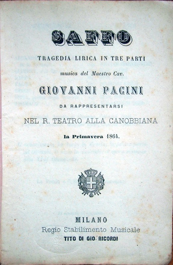 Saffo. Tragedia lirica in tre parti. Musica del Maestro Cav. Giovanni Pacini. Da rappresentarsi nel R. Teatro alla Canobbiana la Primavera 1864