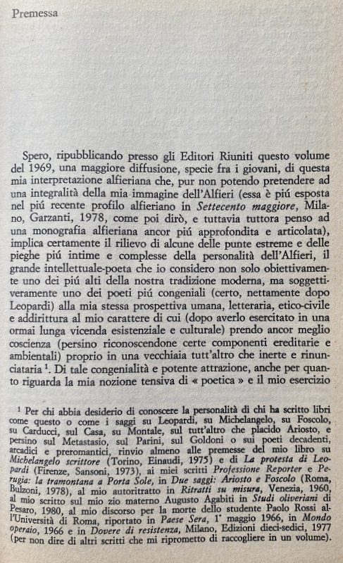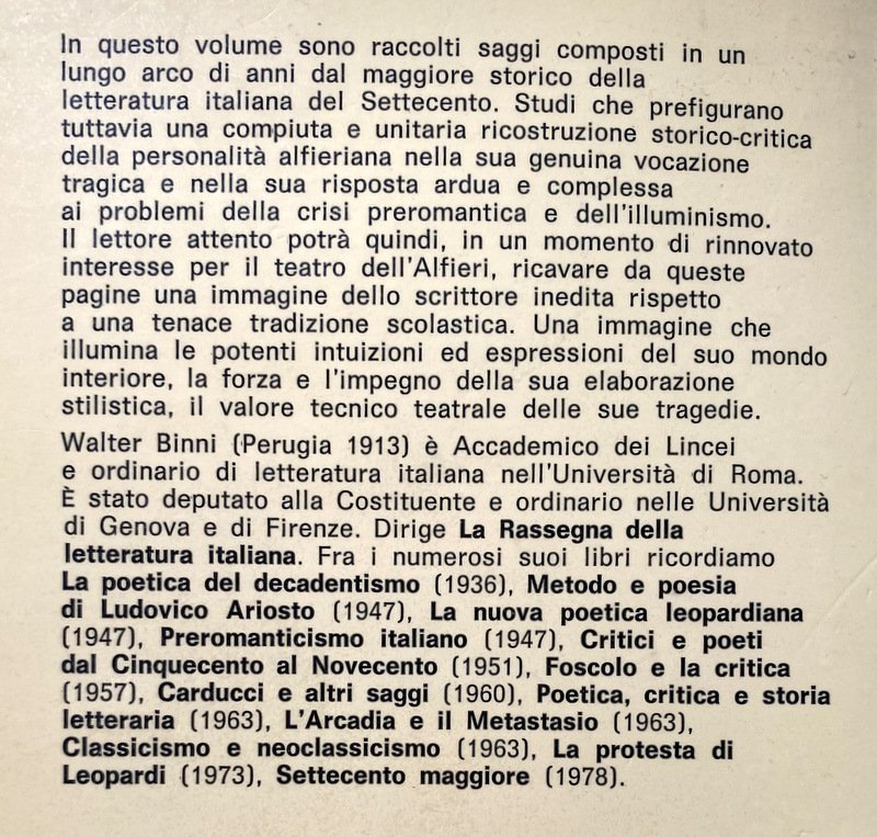 In questo volume sono raccolti saggi composti in un lungo arco di anni dal maggiore storico della letteratura italiana del Settecento. Studi che prefigurano tuttavia una compiuta e unitaria ricostruzione storico-critica della personalità alfieriana nella sua genuina vocazione tragica e nella sua risposta ardua e complessa ai problemi della crisi preromantica e dell'illuminismo. Il lettore attento potrà quindi, in un momento di rinnovato interesse per il teatro dell'Alfieri, ricavare da queste pagine una immagine dello scrittore inedita rispetto a una tenace tradizione scolastica. Una immagine che illumina le potenti intuizioni ed espressioni del suo mondo interiore, la forza e l'impegno della sua elaborazione stilistica, il valore tecnico teatrale delle sue tragedie.