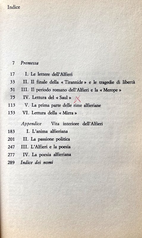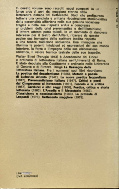 Soggetti: Critica, Storia letteraria, Vittori Alfieri, Letteratura italiana, Italianistica, Studi culturali, Saggi, Teatro, Drammaturgia, opere generali, Bibliografia, Riferimento, Consultazione, Collezionismo, Libri rari Vintage fuori catalogo, Epistolario, Opere generali, Classici, Poetica, Estetica, Romanticismo, Illuminismo, Tragedie, Impegno civile, Saul, Merope, Mirra, Libertà, Tirannia, Tirannide, Politica, Passione, Biografie, Memorie, Lettere, Vita interiore, Poesia, Anima, Spirito, Teatralità, Cleopatra, Oreste, Rime, Esquisse du Jugement Universel, Giornali, Andrea Gustarelli, Periodo romano, Bruto, Raccolte, Vita scritta da esso, Aldo Actis Caporale, Acunha, Augusto Agabiti, Luisa di Stolberg-Gedern Albany, Albergati, Dante Alighieri, Argirò, Ludovico Ariosto, Aristofane, Arteaga, Antonio Avena, Cesare Taparelli d'Azeglio, Paola Azzolini, Baccolo, Michail Bachtin, Baglioni, Prospero Balbo, Baldensperger, Mario Baratto, Barbieri, Emanuela Barellai, Baretti, Barolo, Bava di Sampaolo, Beaumarchais, Bellorini, Bellucci, Bentivoglio, Benvenuti Elena, Bertana, Bertaux, Bettinelli, Bettini, Bianchi, Boni, Bosi, Bourbon di Sorbello, Boyer Bozzelli, Vittore Branca, Brumoy Pierre, Bruscoli Nicola, Buonarroti Michelangelo, Bustico Guido, Cagliostro Alessandro, Calcaterra Carlo, Calosso Umberto, Caluso di Valperga, Calzabigi Ranieri de, Campistron, Camporesi Piero, Canalis Eleonora Luisa, Delio Cantimori, Capitini Aldo, Capucci Martino, Caracciolo, Giosuè Carducci, Lanfranco Caretti, Inghilterra, Carlo Emanuele III di Savoia, Annibale Caro, Stockaristocrat, Castiglioni, Caterina II di Russia, Cazzani, Emilio Cecchi, Cerretti Luigi, Melchiorre Cesarotti, Chateaubriand, André Chénier, Cicerone, Citanna Giuseppe, Citroni Marchetti Sandra, Colli Luigi Leonardo, Consalvi Ercole, Cora Galeazzo, Corner Vendramin Alba, Costa Orazio, Benedetto Croce, Cumiana, D'Alembert, Gabriele D'Annunzio, Dacier André, Davico Bonino Guido, David Michel, Raffaele De Bello, De Giovanni Ignazio, De Lullo Giorgio, De Sanctis, Della Casa, Arnaldo Di Benedetto, Diderot, Didot, Carlo Dionisotti, Domenici Clara, Dondero Marco, Doni Carla, Dossena Giampaolo, Elia Francesco, Eschilo, Euripide, Fabre François-Xavier, Angelo Fabrizi, Luigi Fassò, Federico II di Prussia, Filippo II di Spagna, Luigi Firpo, Francesco Flora, Ugo Foscolo, Francovich, Mario Fubini, Galilei Galileo, Gallo Niccolò, Gargallo, Gassman Vittorio, Giovanni Getto, Enrico Ghidetti, Vincenzo Gioberti, Giorgio III, Giovampietro Renzo, Giovenale, Piero Gobetti, Goethe, Goldoni, Gori Gandellini, Guastalla Rosolino, Guerra Giancarlo, Marziano Guglielminetti, Guidi Alessandro, Helvétius Claude-Adrien, Hobhouse John Cam, Hölderlin Friedrich, Illiano, Jannaco, Jeffrei Francis, Jenni Alfonso, Joly Jacques, La Porte du Theil Jean Gabriel, Lagrange, Lampredi Giovanni Maria, Giacomo Leopardi, Lesage Alain-René, Lindon John, Lucrezio, Luigi XVI, Niccolò Machiavelli, Scipione Maffei, Francesco Maggini, Maillard de Tournon Monica, Manzoni Alessandro, Marani Alma Novella, Marcello Marco Claudio, Marcellus, Marino Giovan Battista, Mazzamuto, Mazzatinti Giuseppe, Mazzei Filippo, Metastasio, Milanesi Carlo, Mocenni Magiotti Quirina, Attilio Momigliano, Montaigne, Eugenio Montale, Montemurri, Montesquieu, Vincenzo Monti, Muscetta Carlo, Neck Willem, Nietzsche, O'Neill, Orazio, Ornato Luigi, Ottolenghi Leone, Ovidio, Ozà Carlotta Amoretti, Paciaudi Paolo Maria, Morena Pagliai, Paoli Pasquale, Paolo III, Giuseppe Parini, Alessandro Passerin d'Entreves, Cesare Pavese, Pazzini Carli Giuseppe, Pellegrini, Persio, Petrarca, Piatti, Ippolito Pindemonte, Pirandello, Pisanti, Pistoj Candido, Pitt Ligonier Penelope, Pizzelli Cuccovilla Maria, Plutarco, Prévost Antoine François, Prezzolini, Prosio Pier Massimo, Provana, Salvatore Quasimodo, Quintana José Matías, Jean Racine, Ezio Raimondi, Raffaello Ramat, Teresa Regoli Mocenni, Renier Rodolfo, Ricaldone Luisa, Riccoboni Luigi, Ristori Adelaide, Rolli Paolo, Rosario Romeo, Römer Christine, Rossi, Rotrou, Rousseau, Luigi Russo, Ruzzante, Sabatier de Cabre, Saint-Réal, Sallustio, Natalino Sapegno, Schlegel, Scudéry Madeleine, Seneca, Shakespeare, Sismondi Jean Charles Léonard Simonde, Sofocle, Stazio, Stendhal, Sterpos Marco, Stuart, Suard Jean-Baptiste-Antoine, Tacito, Tagliazucchi Girolamo, Tana Agostino, Tassi Francesco, Torquato Tasso, Isabella Teotochi Albrizzi, Terenzio, Teza, Girolamo Tiraboschi, Traspadini, Trovato, Turinetti Falletti Gabriella, Tuzet Hélène, Várela Juan Cruz, Varese Claudio, Venturi Franco, Verri Alessandro, Pietro, Vigny Alfred de, Vigorelli Gian Carlo, Vincenti, Virgilio, Vischi Luciano, Luchino Visconti, Volpicelli, Voltaire, George Washington, Affetti Agide Amore Caluso Ciniro David Animo Uomo disperato Dolore Dramma Egisto Elegiaca Eroica Euriclea Figli Forza Gionata Impeti Infelice Intima intuizione ispirazione Lotta Maffei Malinconia Micol Miseria e nobiltà Misogallo Morte Natura Passione patria Pereo Personaggi Personalità Poetica Polifonte Politici Morali Popolo Preromanticismo Rappresentazione Rivoluzione francese Romantica Scena Scritti politici Sdegno Senso Sentimentale Sentimento Sfogo situazione solitudine Sonetto Sublime Sviluppo Svolgimento Tensione Tiranno Tono Tormento Tragedie alfieriane Valore Virtù Volontà Socialismo Criticism Literary history Italian literature studies Cultural studies Essays Theatre Dramaturgy general works Bibliography Reference Consultation Collectibles Rare books out of print Letters General works Classics Poetics Aesthetics Romanticism Enlightenment Tragedies Civil commitment Myrrh Freedom Tyranny Politics Biographies Memoirs Letters Inner life Poetry Soul Spirit Theatricality Orestes Rhymes Newspapers Roman period Brutus Collections Life written by it Affections Love Soul Desperate man Pain Drama Aegisthus Elegiac Heroic Eurycleia Sons Strength Jonathan Impets Unhappy Intimate intuition inspiration Fight Melancholy mind Misery and nobil