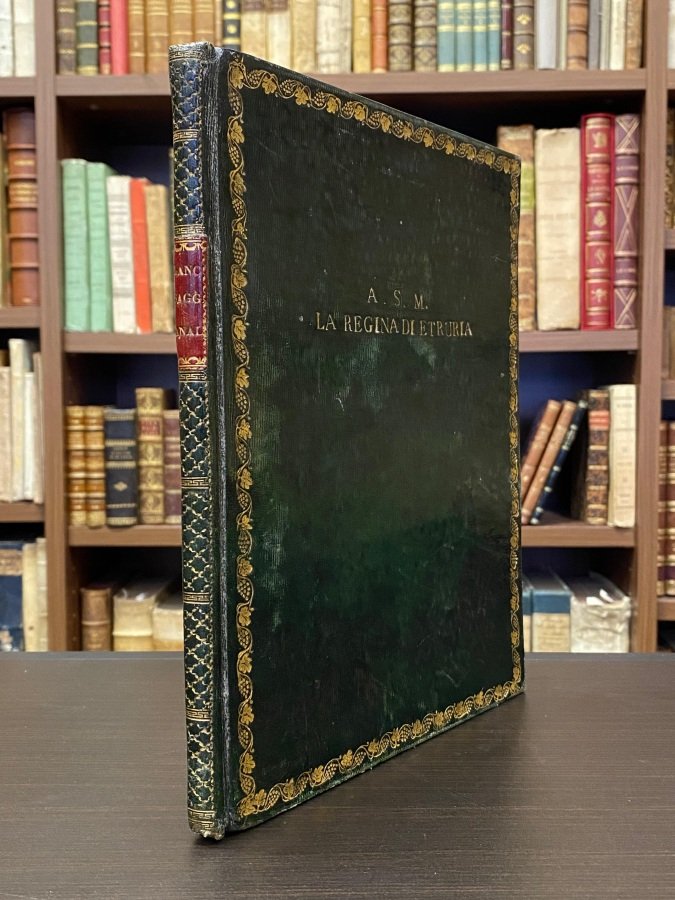 <span style="font-style: normal;">In-4° (cm. 24,8), pp. [4] 62 [2] su carta forte, in ottimo stato e ad ampi margini. Interessante legatura di dedica in pieno marocchino verde con piatti inquadrati da cornice in oro </span><i>à la vigne</i>, dedica in oro al centro del piatto anteriore a <i>La Regina di Etruria</i> ovvero Maria Luisa di Borbone-Spagna (1782-1824), titolo in oro su tassello e decorazioni in stile Bozerian al dorso; risguardi marmorizzati. Edizione originale di un raro testo sulle acque minerali e medicinali napoletane, le cui analisi sembra dovessero proseguire con una seconda parte, mai pubblicata. Maria Luisa all'epoca governava Lucca nello spirito illuminato dei sovrani assolutisti, tentando di cancellare ogni traccia del governo precedente di Elisa Bonaparte. Superbo esemplare. (L)