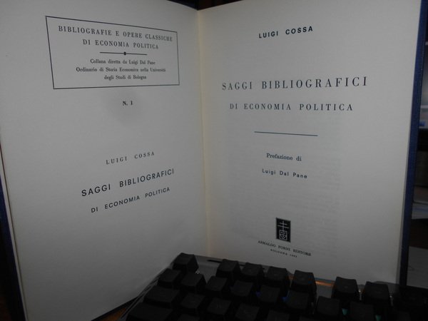 LUIGI COSSA. Bologna (Sala Bolognese), 1963. SAGGI BIBLIOGRAFICI di Economia Politica. Prefazione di Luigi Dal Pane. In-8°, tela bleu edit. con titolo in oro al dorso. xxii, 452 pp. Perfetto esemplare. Uff. B - III - 4