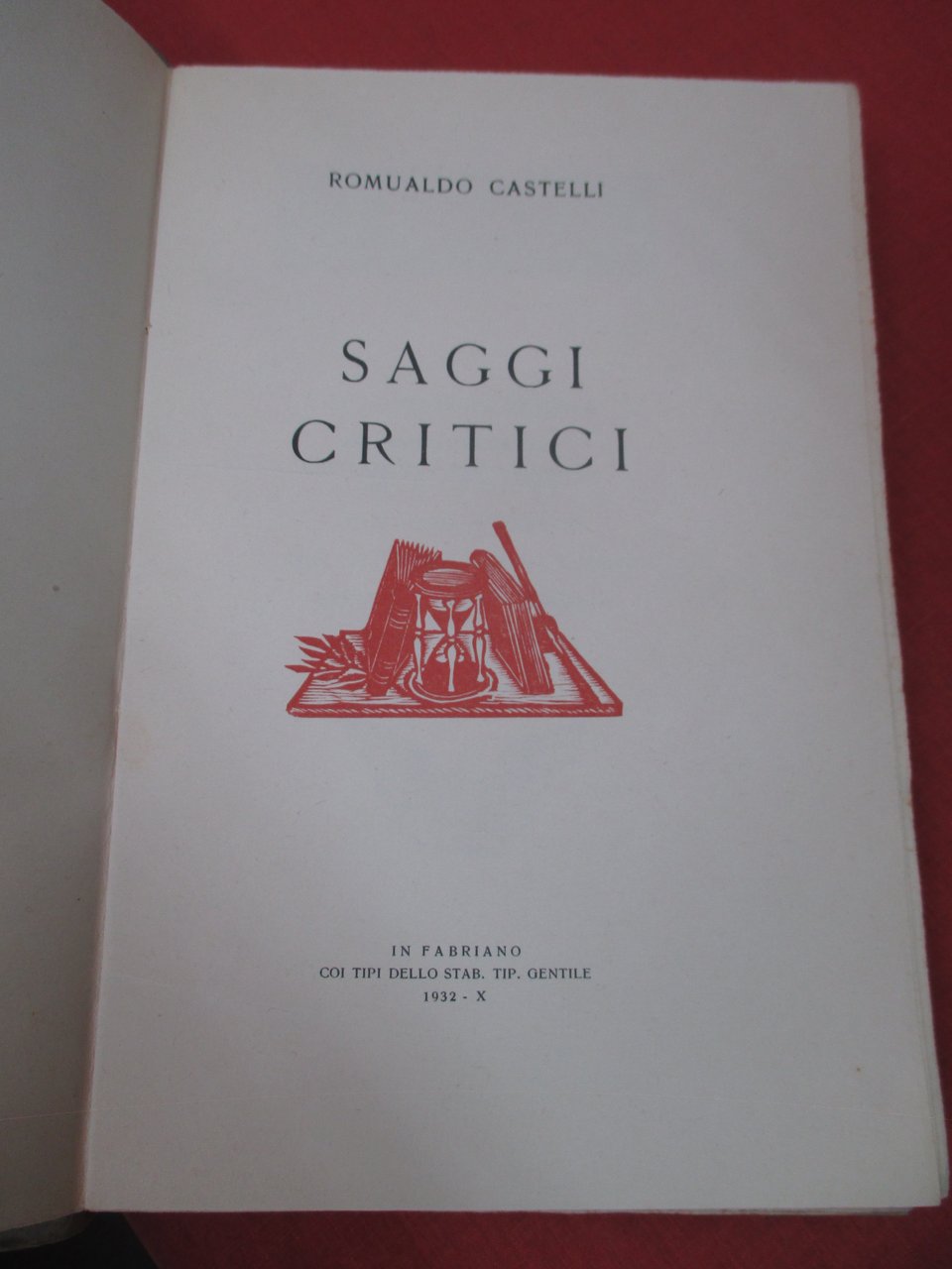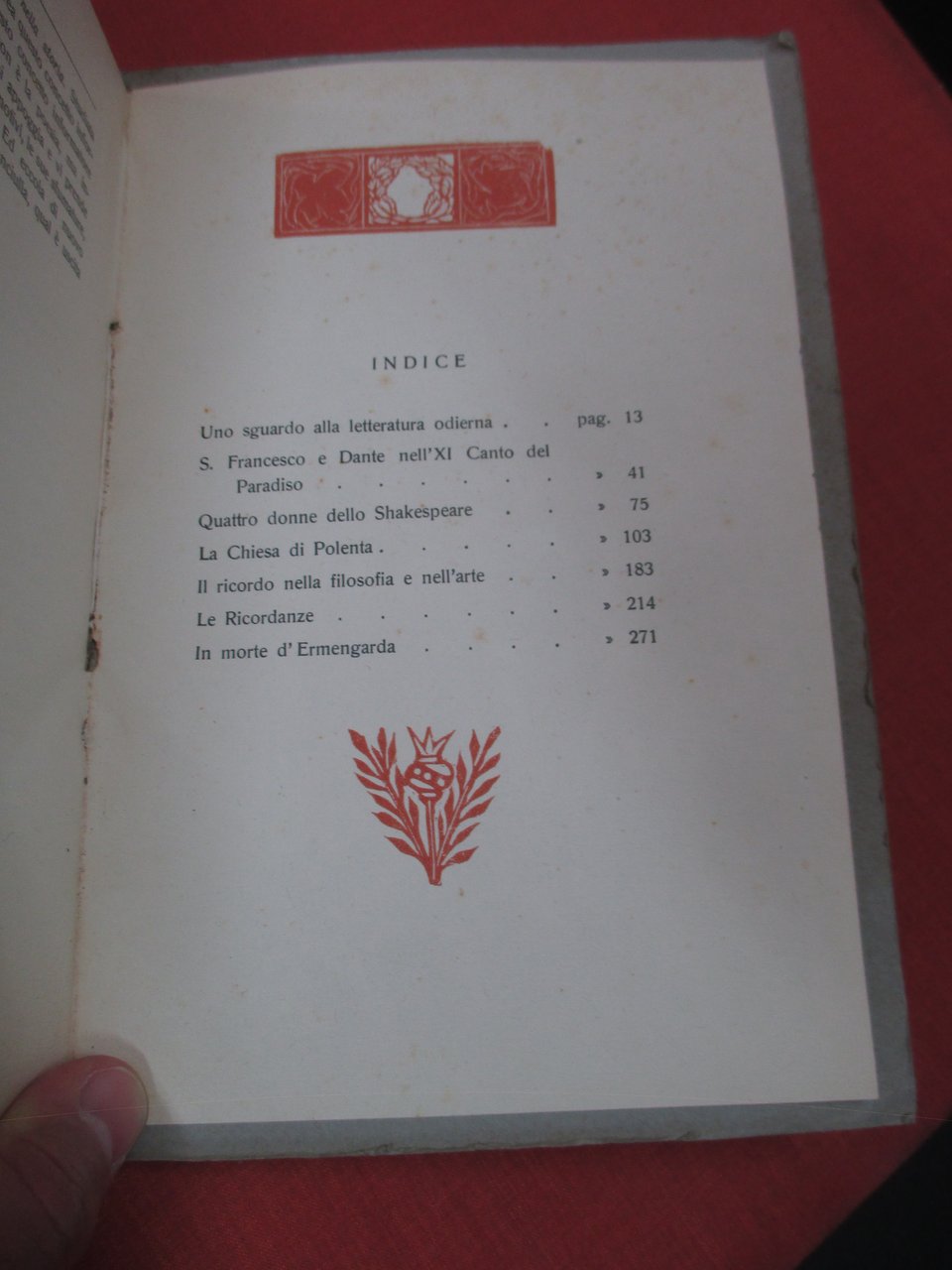 In – 8vo, brossura editoriale illustrata, pp. 322 ( 2 ). Copertina, testatine e finalini xilografici di Bruno Da Osimo. Indice del volume: Uno sguardo alla letteratura odierna; S. Francesco e Dante; Quattro donne dello Shakespeare; “ La Chiesa di Polenta “ di Giosuè Carducci; Il ricordo nella filosofia e nell'arte; Le “ Ricordanze “ di Giacomo Leopardi; In morte d’Ermengarda di Alessandro Manzoni.
