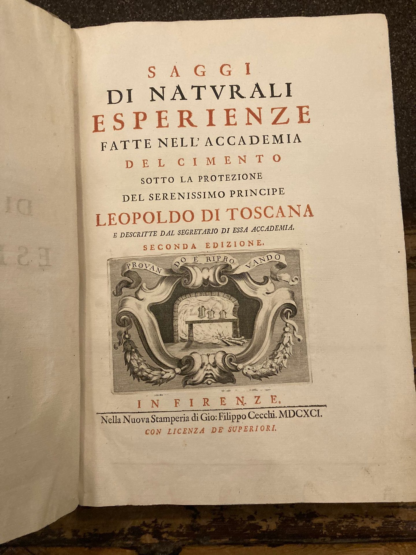 In-folio (370x260mm), pp. (16), CCLXIX (1), (22) di sommari e indici (ultima bianca). Legatura coeva in tutta pergamena con titolo manoscritto su tassello applicato (piccole mancanze) al dorso con nervetti passanti alle cuffie, tagli spruzzati blu di Prussia. Vignetta al frontespizio stampato in rosso e nero, ritratto calcografico ripiegato di Cosimo III (Arnold Van Westerhout), 75 belle tavole nel testo incise a piena pagina con esperimenti e strumenti scientifici e bei fregi, testatine, finalini e capolèttere ornati e figurati il tutto inciso in rame dal Modiana. Ottimo esemplare fresco e marginoso. Fondamentale raccolta di saggi, in seconda edizione, maturata nell'ambiente della scuola galileiana e primamente pubblicata nel 1667. L'opera, redatta dal Magalotti, Segretario dell'Accademia, descrive le esperienze fatte da lui e dagli altri Accademici del Cimento, tra i quali Vincenzo Viviani, Paolo e Candido Del Buono, Alessandro Marsili. Interessante descrizione di termometri, igrometri, barometri e pendoli. Riccardi II, 407. Cinti 163. Brunet V/29. Graesse, IV, 335. Dibner, Heralds of Sciences, 82. Boffito, Gli strumenti della scienza, pp. 133-4. Gamba 853. Maylender, Storia delle Accademie d'Italia, II, pp. 7-16. Knowles Middleton, The experimenters. A study of the Accademia del Cimento, Baltimore,1971. Vinciana, 1665. Razzolini, p. 215. Carli Favero, 815. Riccardi, II, 407. H.B.S., 38591. Carlo Cordié in Diz. Bompiani d. Opere, VI, 440-441. Manca al Bruni-Evans.