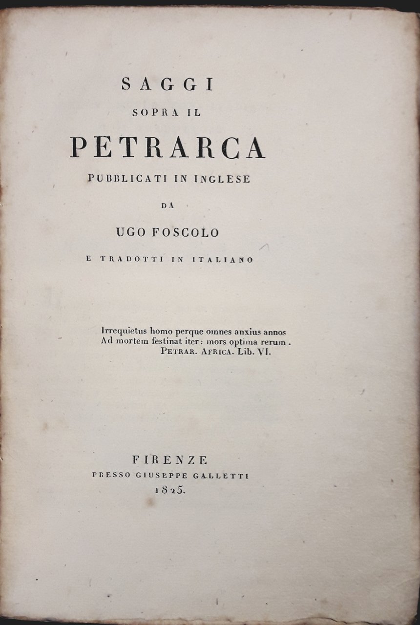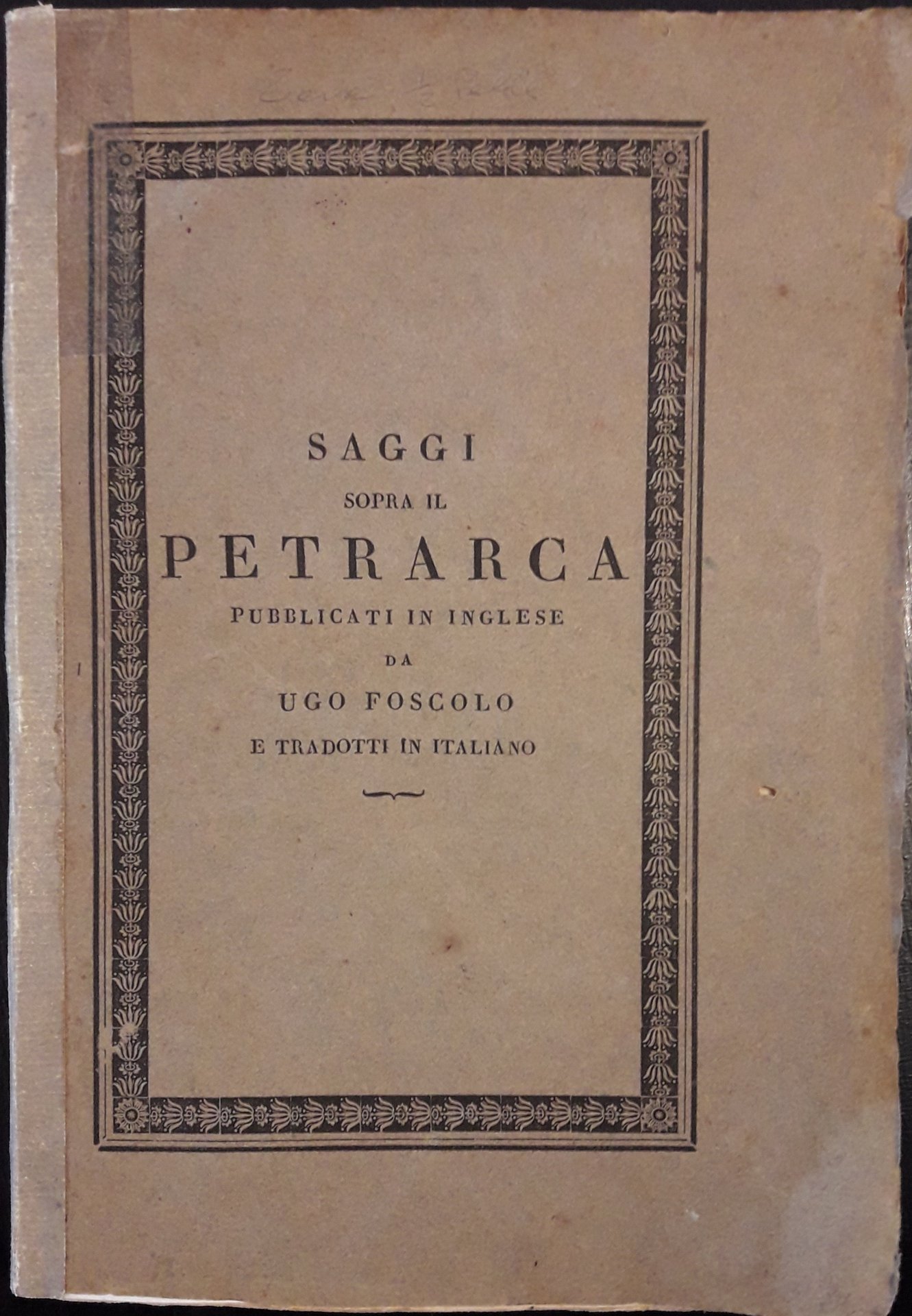 Seconda edizione in italiano degli "Essays on Petrarch". La prima (trad. Camillo Ugoni) si era avuta a Lugano nel 1824. In 8°, p.XV(1)190(2). Qualche leggera fioritura. Barbe. Brossura originale col dorso rifatto. (Ottolini,357).